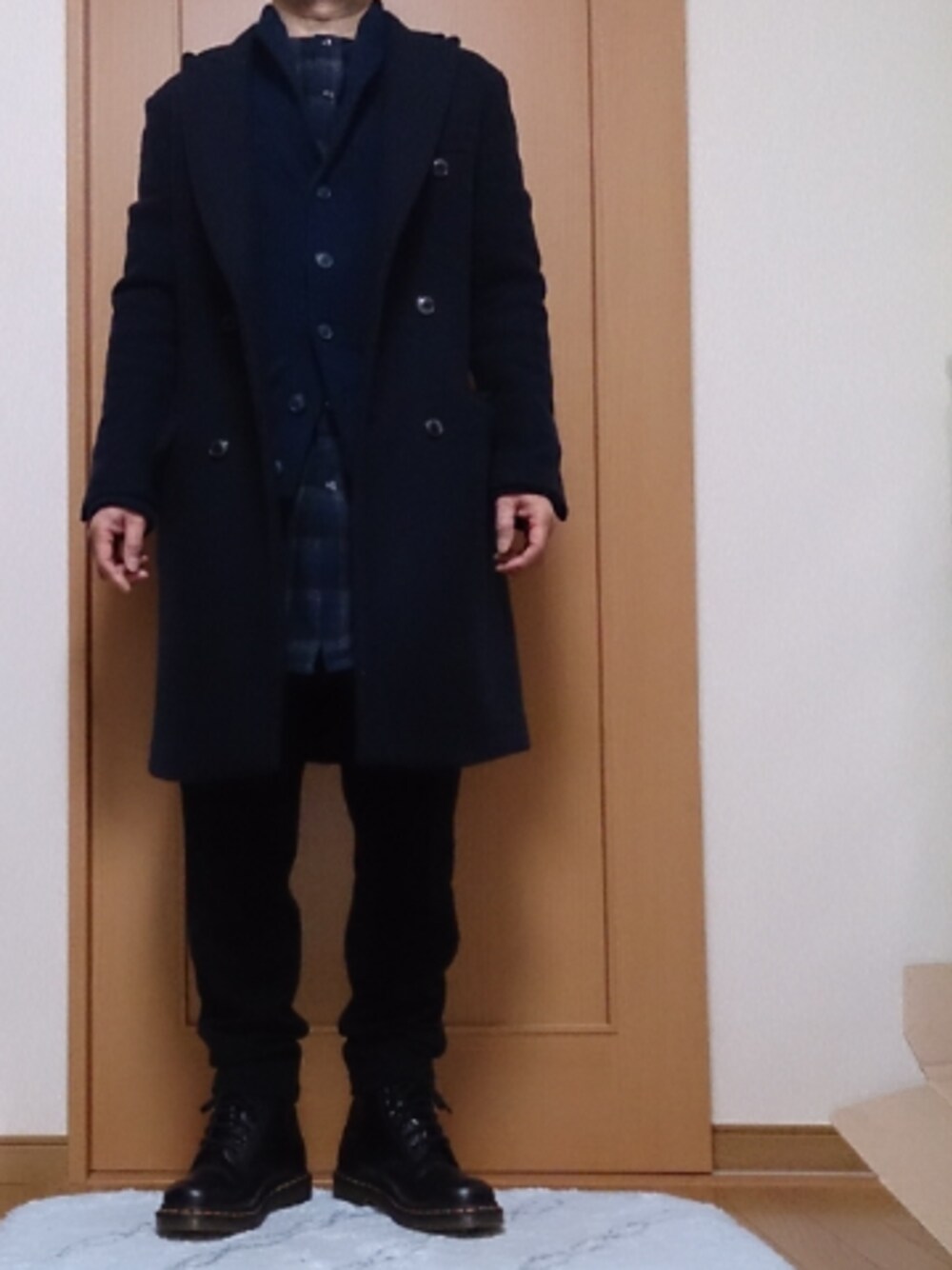 Happy Xmas♪ 最近ほんと寒い! 部屋の中でも7℃しかない(>_<) 今日はチェックのノーカラーロングシャツにそれだけでは寒いのでカーディガンを羽織り さらにパンツはUNIQLO×LEMAIREのタッグウールパンツ あったか~い! ブリティッシュ風で少し細身のロングコートとブリティッシュのDr.Martensのブーツはやはり合いますね(^^)