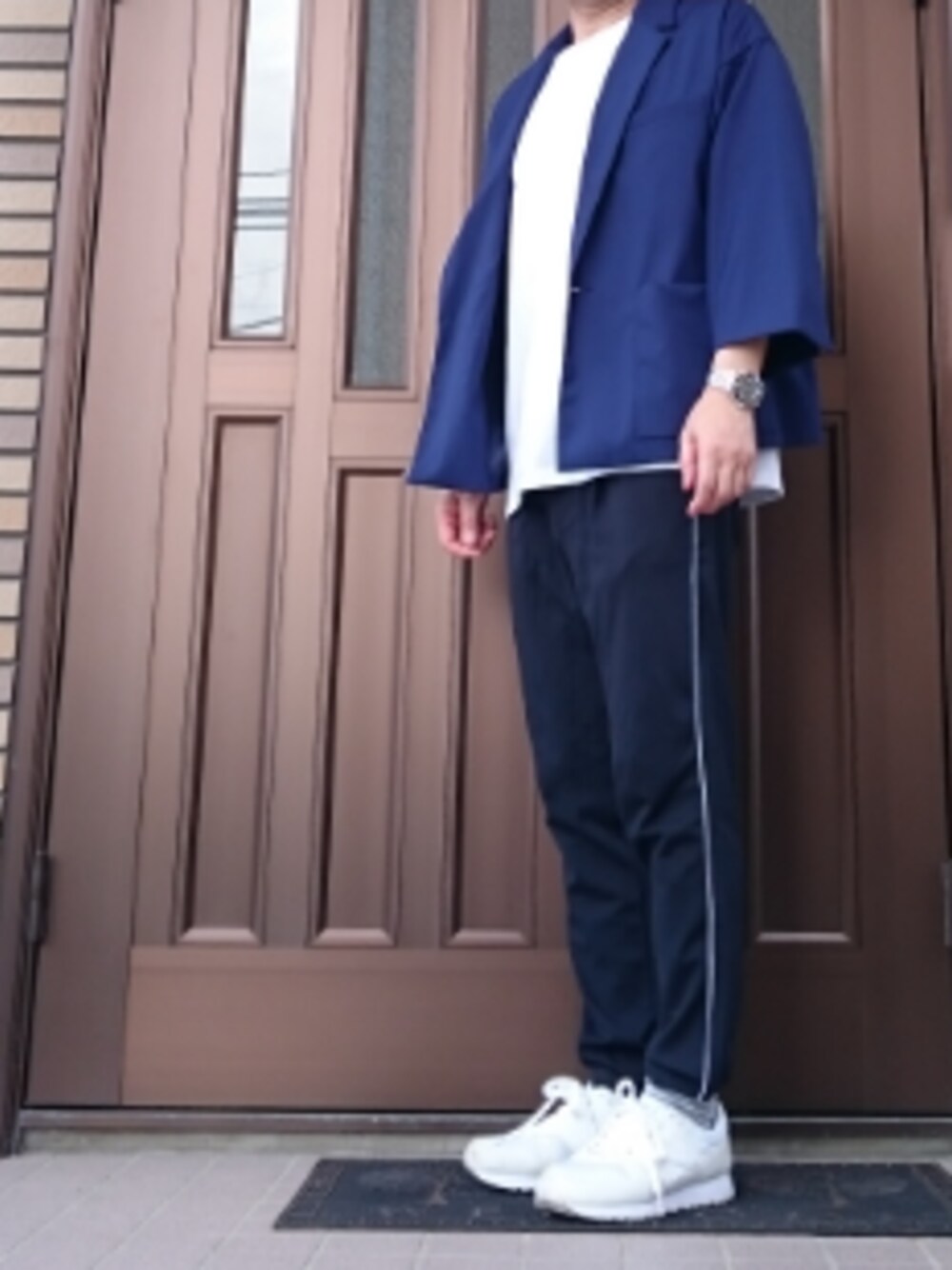 夜ジャケットを着て出かけようとしたけど、あまりの暑さにシャツに着替えた😅 ラインパンツはnano.・universe スニーカーはnew balance
