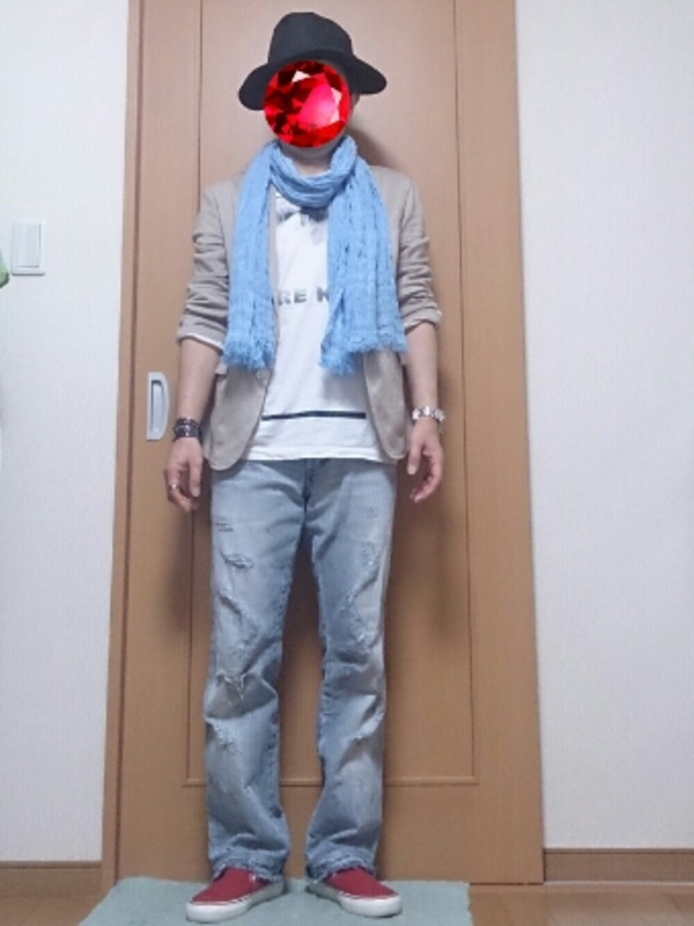 おはよーございます♪ 今日も天気が良くて気持ちいい(^o^)/ 今日は薄くて軽い夏ジャケットを羽織って なんか夏が近づくとジャケットを着たくなる(^^; 新入りのストールとリストバンド ハードなリストバンドするだけで普通のジャケットスタイルも違ってみえるかな!? ストールは夏らしい色が気にいって(^^) この格好だと白スリッポンの方がいいけど 赤スリッポン最近履いてなかったから履く笑