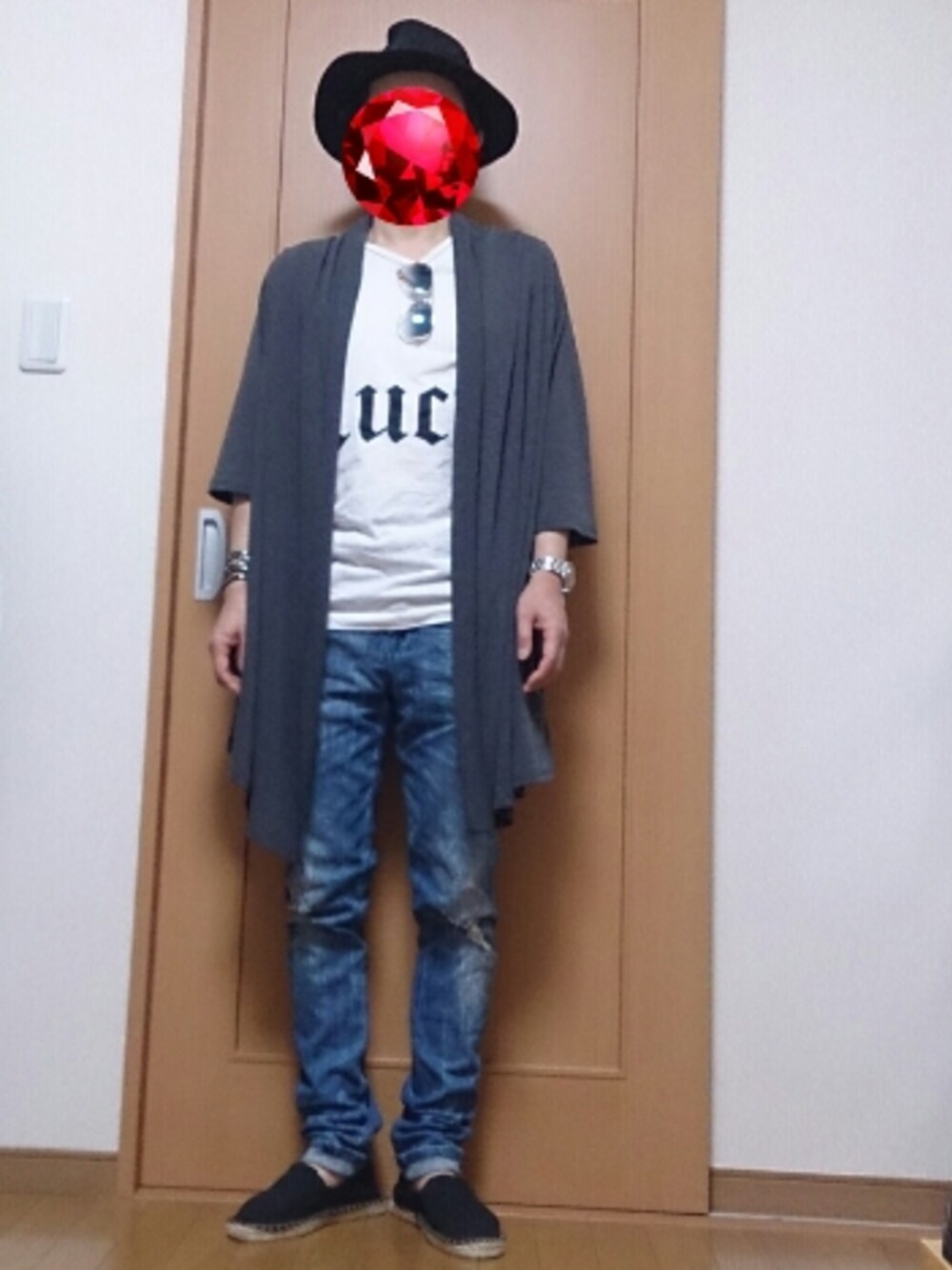 おはよーございます♪ だんだんと蒸し暑くなってきましたね(^^; 今日は7分袖のカーディガンを使ったコーデ 本格的に暑くなる前になるべく着たい DIESELのロゴTシャツにダメージジーンズを合わせた ハット、リストバンドでハードに(^^) ではよい1日を~!