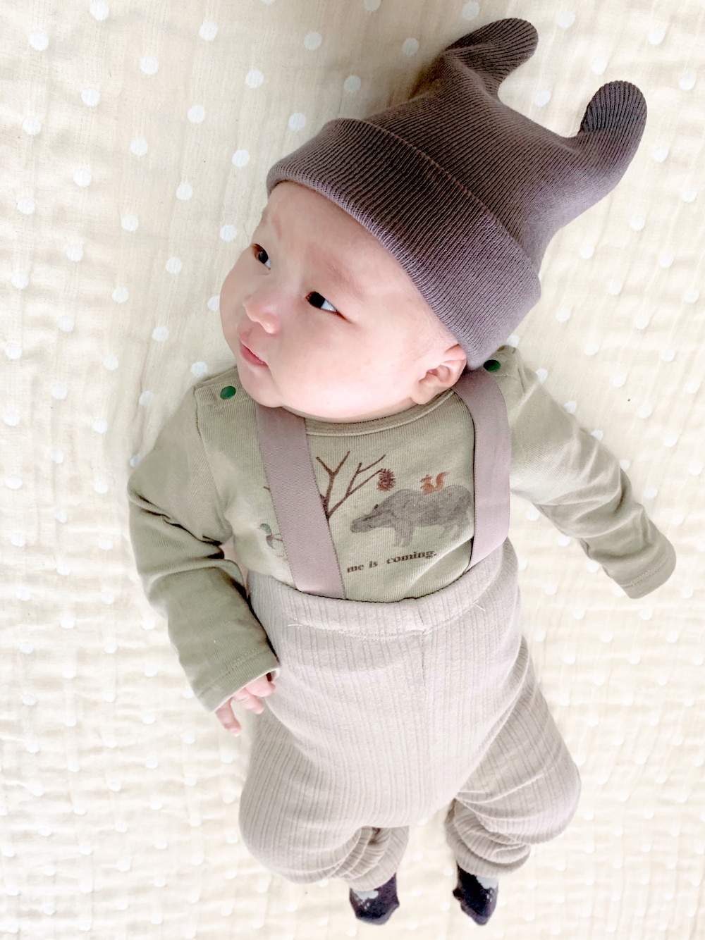 娘が小さい頃に、よくお世話になってたbootakidsさんのお洋服を久しぶりに購入!サスペンダー付きのレギンスは生後2ヵ月の息子にもぴったり♪ ビーニー。。頭大きめな息子が被ると耳っていうより、クワガタっぽい🤣
