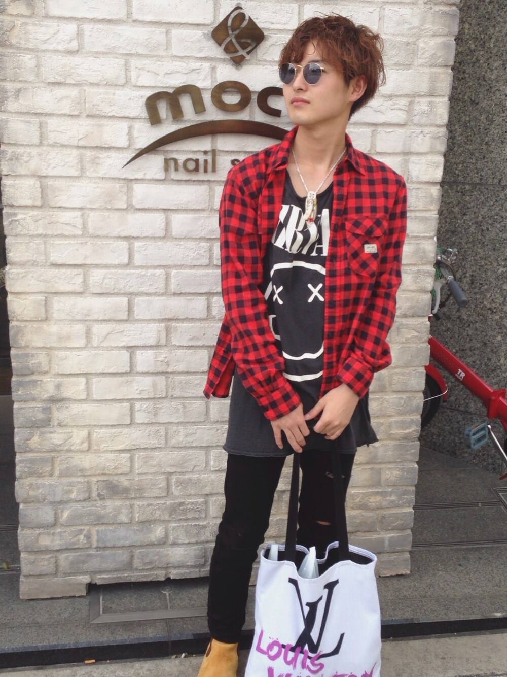 久々の投稿です❗️ ネルシャツを久々に合わせてみました 新作のオーダーメイドのサングラスもすごく気に入ってます✨✨ レンズはトムブラウンから取り寄せました トートバックもお気に入りヴィトンパロディ🎵