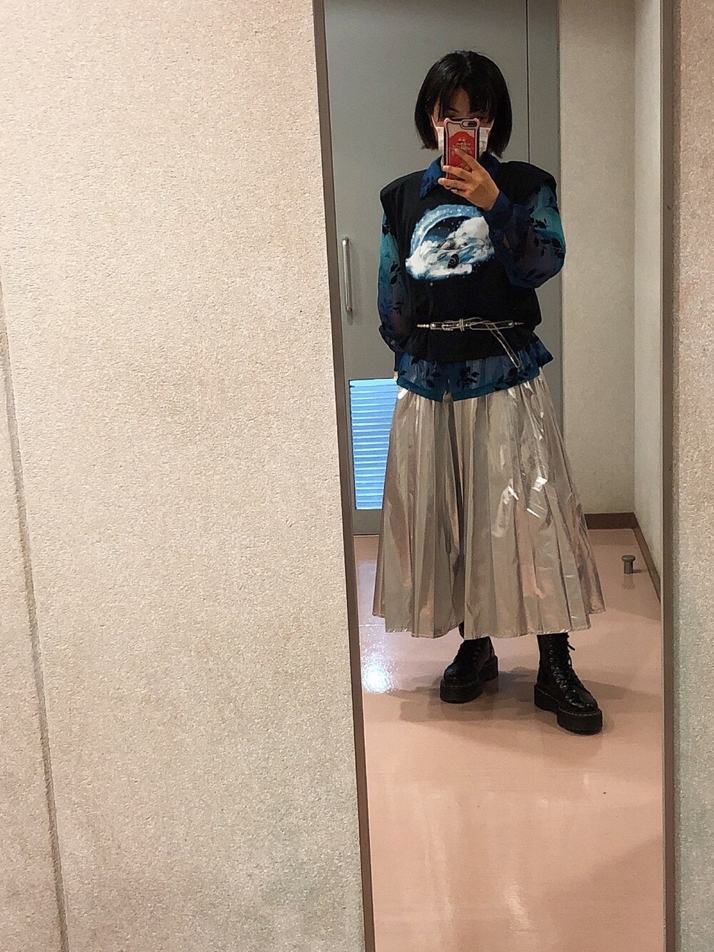 中の柄シャツは古着で、上のトップスはH&MでスカートはDearのものです! テーマは「近未来」