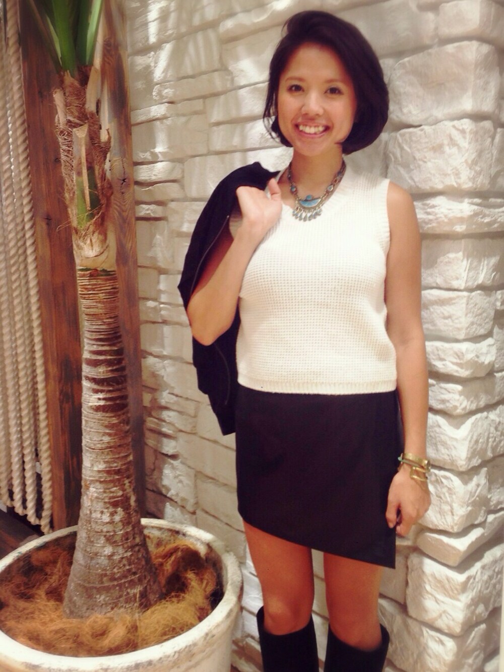 どんなコーデにも使えるシンプルニットトップス! ボトムはレザーのスカートとロングブーツで秋コーデ♪ デニムとの相性も抜群なのでたくさん着まわしちゃいましょう!!