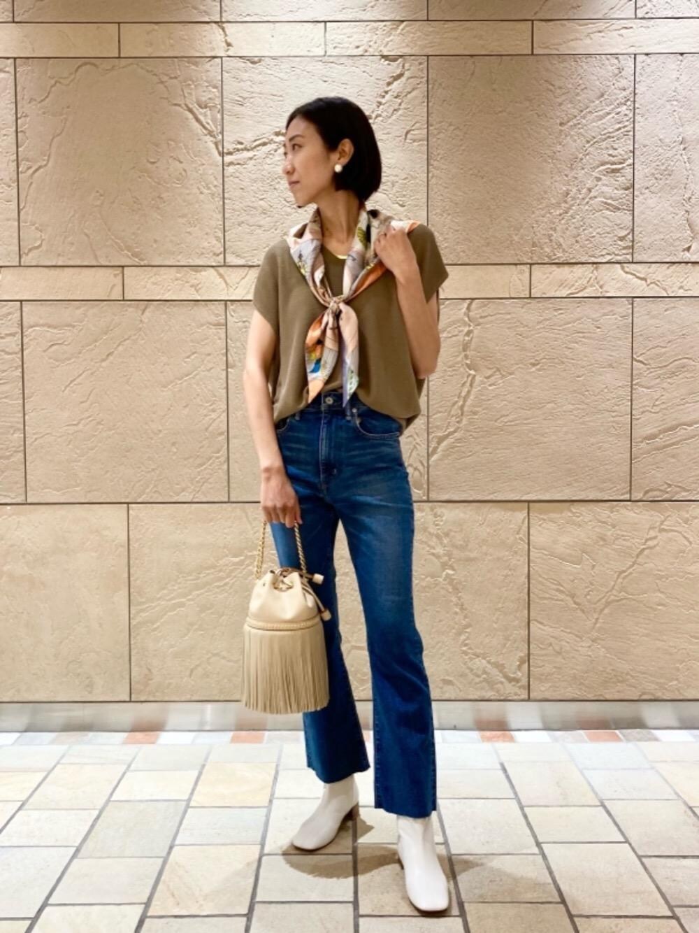【普段サイズ】 トップス:38 ボトムス:36or38 シューズ:24㎝ 【サイズ感】 トップス:ゆったり。後にボリュームがでます。 ボトムス:ウエスト、ヒップ、フィット感あり。 シューズ:標準的。 【素材感・着心地】 トップス:さらりとした素材感で、軽い着心地。 ボトムス:しっかりとしたデニム素材。ストレッチはやや効いていますが、履き慣れるまでは、硬さがあります。 シューズ;とても柔らかい素材で、ソフトな履き心地。 【コーディネートポイント】 さらりとした清涼感のあるニットに、スカーフやブーツを合わせて、秋のテイストを少しだけプラスしました。