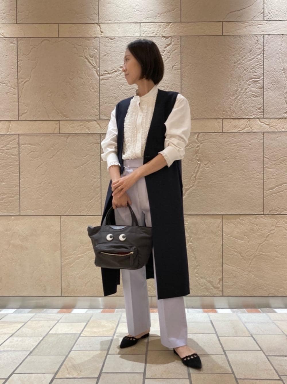 【普段サイズ】 トップス:38 ボトムス:36or38 シューズ:24㎝ 【サイズ感】 トップス:ゆったり。 ベスト:ゆったり。着丈は膝が隠れる長さ。 ボトムス;大きめ。ワンサイズ下を選びました。 【素材感・着心地】 トップス:少し厚みのある綿素材。しなやかで柔らかな肌あたりです。 ベスト:ハリがあり程よい厚み。秋、冬、春先まで長く着用できます。アームホールはゆとりがあり、袖にボリュームのあるブラウスや中肉のニットとも合わせられます。 ボトムス:ハリのある素材ですが、ウエストにタックが入るストレートラインの為、動きやすいです。 【コーディネートポイント】 フリルシャツと淡めトーンのパンツと組み合わせ、ロングジレを羽織ってシャープな印象に。ジレは季節の変わり目に大活躍のアイテムです。