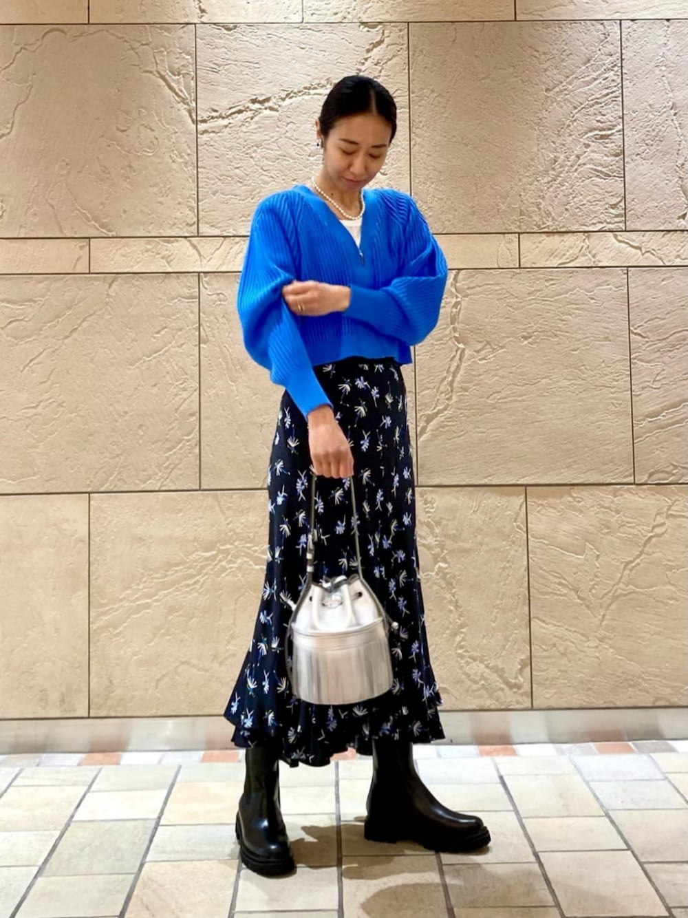 今年らしいショート丈のカーディガンにダンサーの柄がポイントのスカートを合わせました。 カーディガンは前ジップで、ジップを閉じて着るとVネックのプルオーバーのようにも見えますし、ボタンよりすっきりとした印象でジャケットのような雰囲気にもお召しいただけます。 ロングスカート、ワンピース、ワイドパンツと相性の良いシルエットです。 【サイズ感・着心地】 カーディガン:着丈は短めで、身幅と袖はゆったりとしています。ざっくりとしたアゼ編みですが、重みはなく軽い着心地です。 トップス:フィット感あり。透け感のある薄い素材です。 シューズ:大きめ。