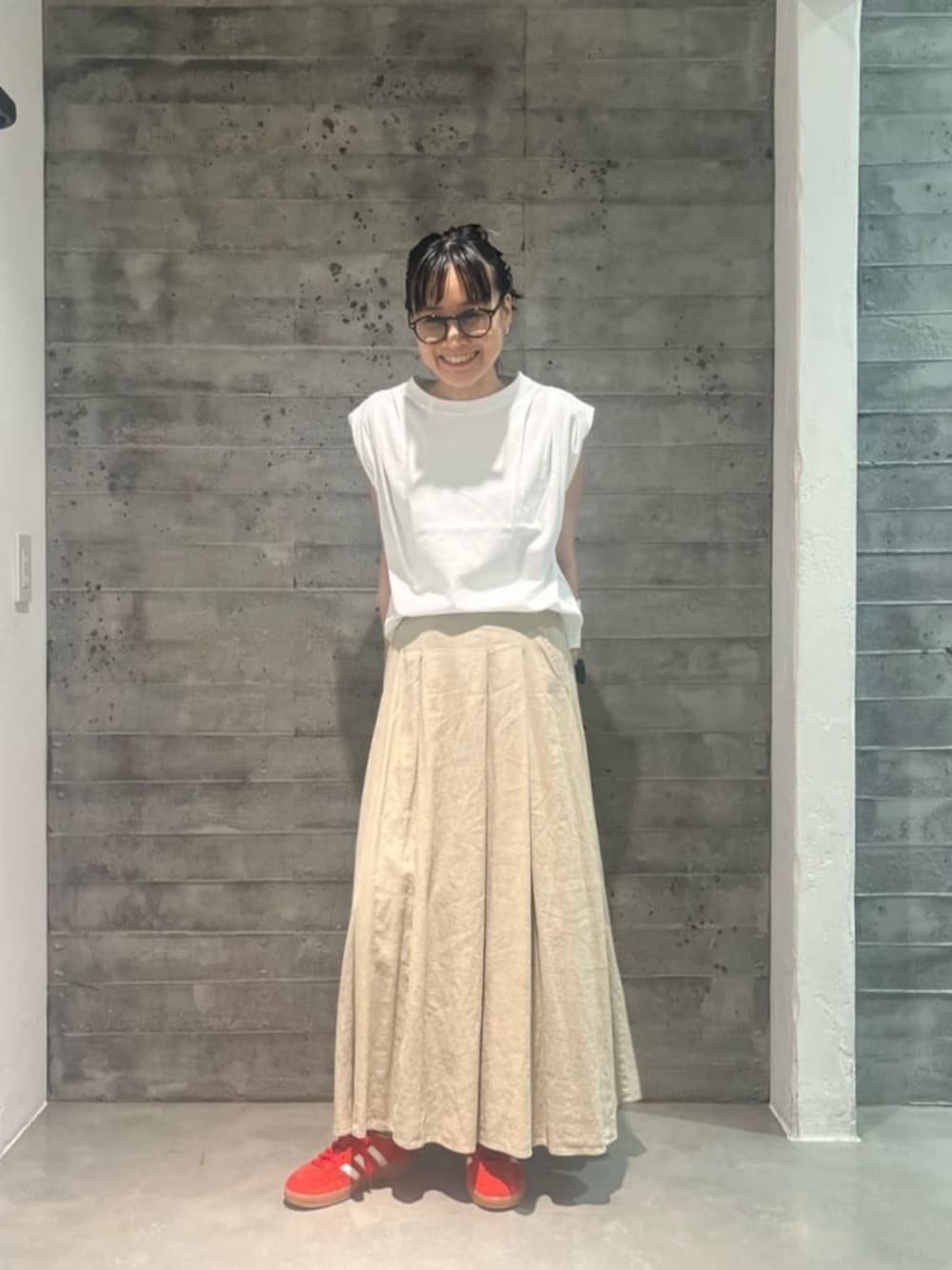 ・身長:153cm ・普段サイズ:トップスS/ボトムスS/シューズ23cm 【サイズ感】 トップス:フリーサイズ/標準 スカート:Sサイズ着用/標準 別でペチコートあります シューズ:23cm着用/標準 【コーディネートポイント】 ギャザートップス×フレアスカートのフェミニンな組み合わせを赤スニーカーでカジュアルダウンしました。シンプルなのでアクセサリーは存在感のあるものを選んでいます。