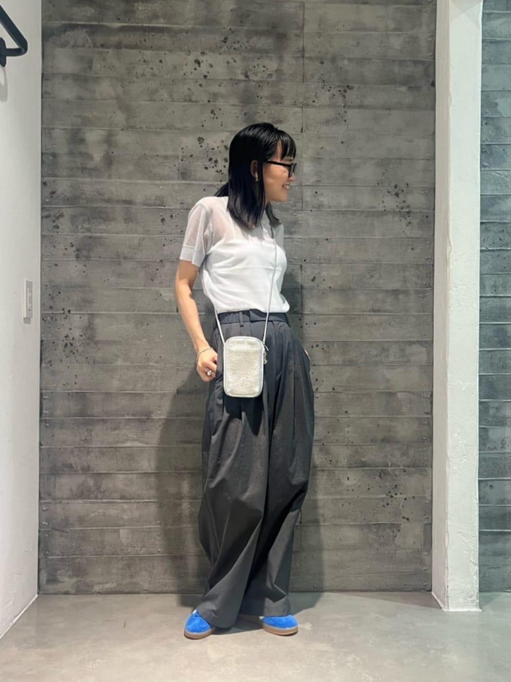 ・身長:153cm ・普段サイズ:トップスS/ボトムスS/シューズ23cm 【サイズ感】 トップス:フリーサイズ/コンパクト インナー:フリーサイズ/ややショート丈 パンツ:XSサイズ着用/ゆったり お直し無しで履けます シューズ:23cm着用/標準 【コーディネートポイント】 ライトブルー×ダークグレー濃淡の異なる組み合わせで対比させ、メリハリを出しました。トップスの色味と合わせた鮮やかなスニーカーをアクセントにしています。