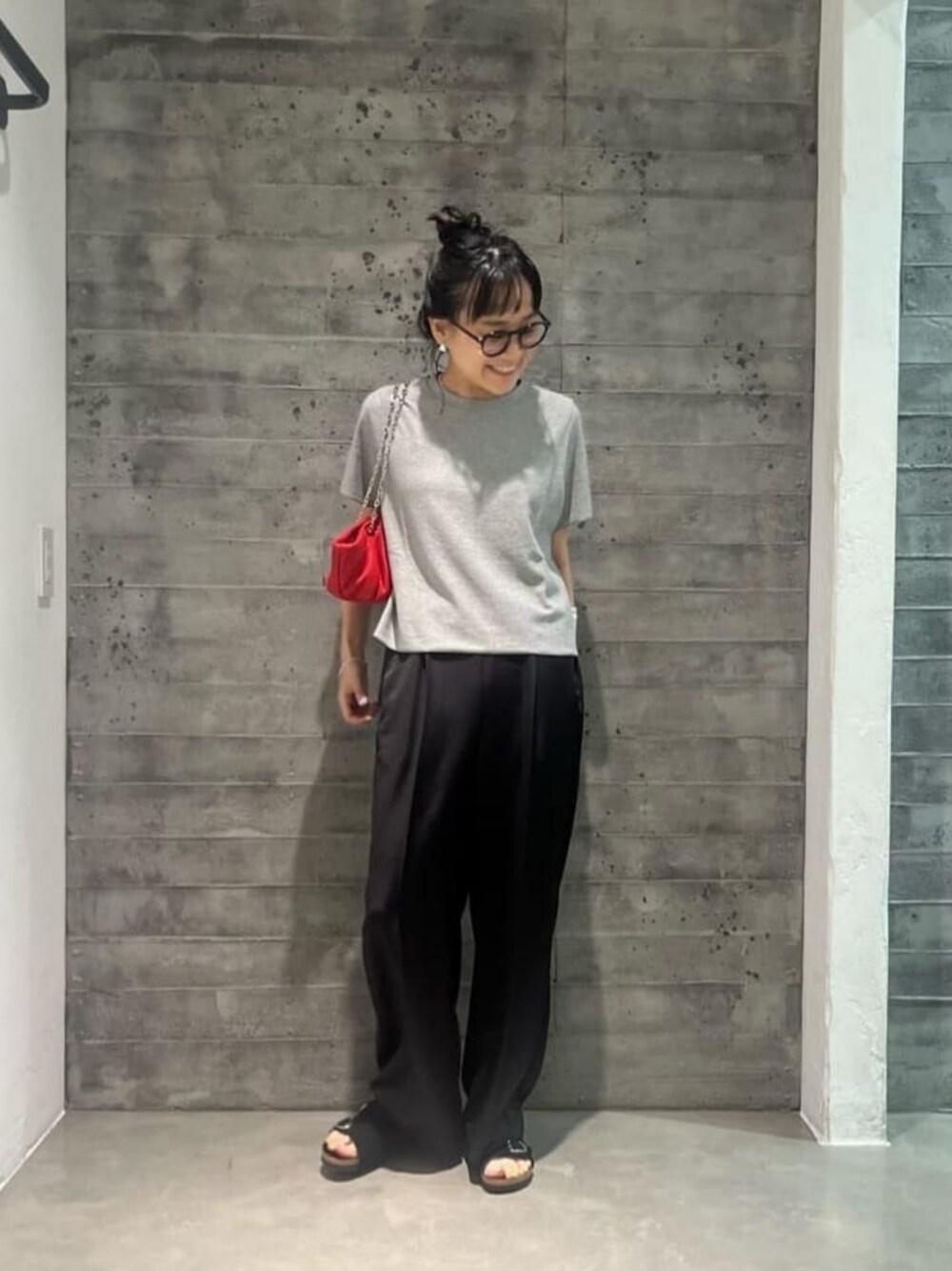 ・身長:153cm ・普段サイズ:トップスS/ボトムスS/シューズ23cm 【サイズ感】 トップス:フリーサイズ/コンパクト パンツ:Sサイズ着用/程よくゆとりあり お直し無しで履けます シューズ:23cm(36)着用/標準 【コーディネートポイント】 ダークトーンの組み合わせも、ラメトップス×サテンパンツで華やかな印象にしました。赤バッグをアクセントにレディな雰囲気もプラスしています。