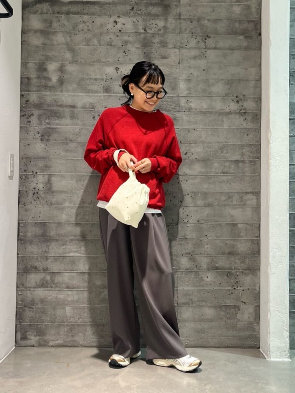 ・身長:153cm ・普段サイズ:トップスS/ボトムスS/シューズ23cm 【サイズ感】 トップス:フリーサイズ/程よくゆとりあり パンツ:XSサイズ着用/ゆったり シューズ:23.5cm着用/ちょうど良い 【コーディネートポイント】 赤のスウェットにタックワイドパンツを合わせたカジュアルコーデ。黒に比べて優しい色味のグレーなら、キツくなりすぎずやわらかい印象にまとまります。真っ赤ではないワントーン抑えめの赤なら取り入れやすいのでオススメです。