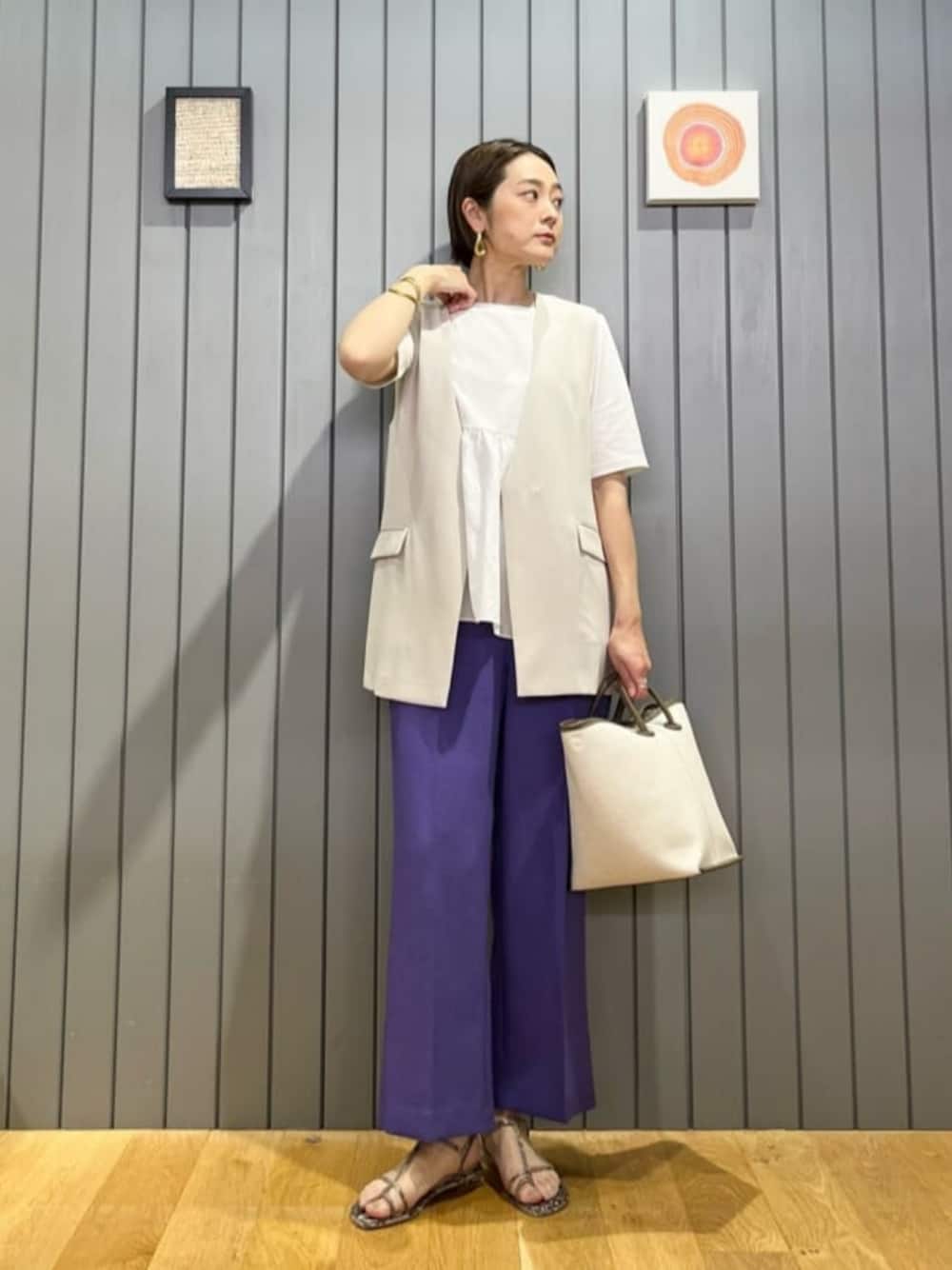 【サイズ感】 カットソー:標準 ジレ:標準 パンツ:標準 シューズ:標準 【コーディネートポイント】 フェミニンな雰囲気のカットソーに、ジレとパープルのパンツを合わせ、甘くなり過ぎないようにコーディネートしました。