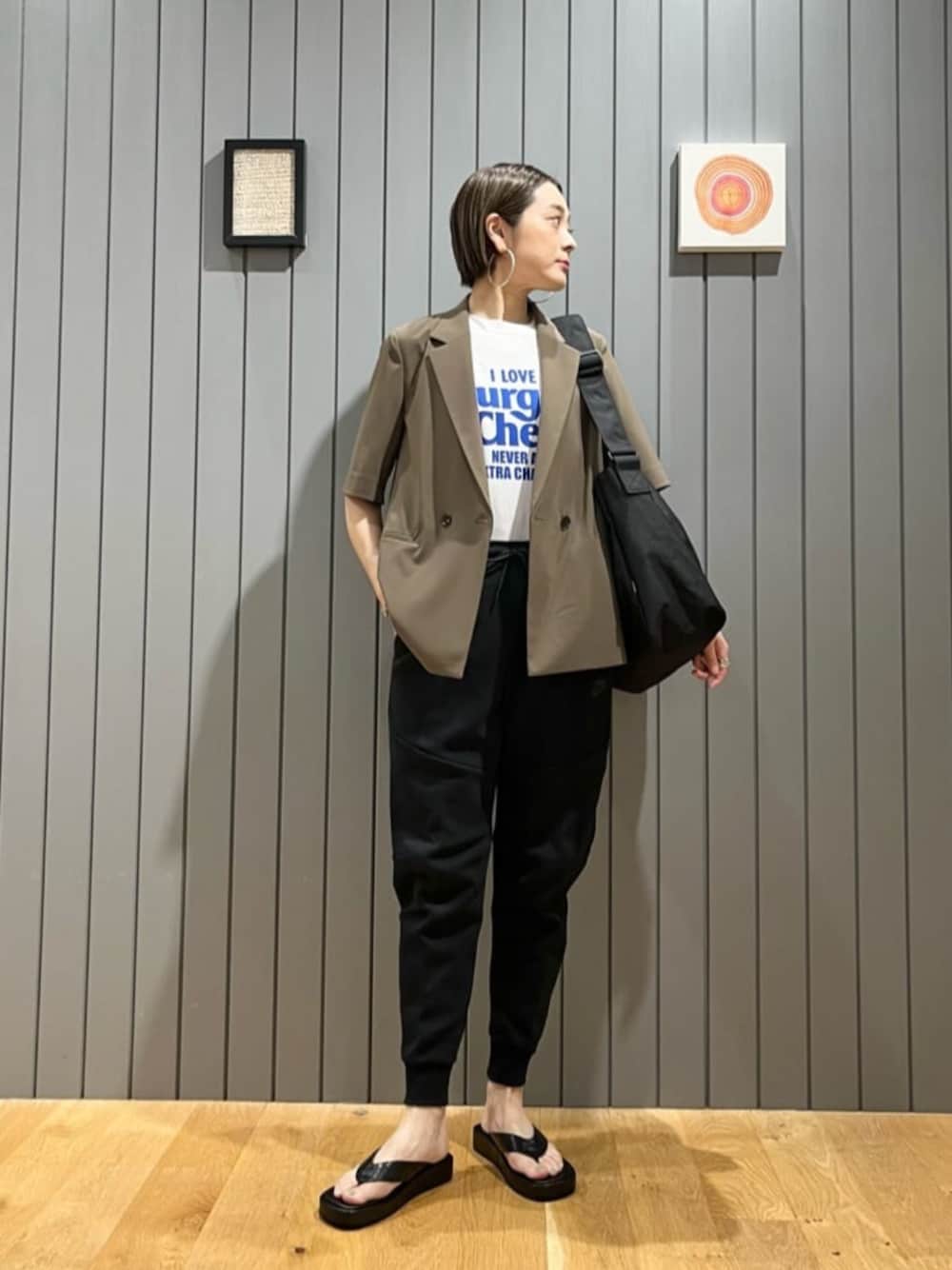 【サイズ感】 ジャケット:標準 Tシャツ:標準 パンツ:ややゆったり(メンズMサイズ着用) シューズ:標準 【コーディネートポイント】 半袖ジャケットにスポーティーなパンツを合わせてカジュアルにコーディネートしました。パンツはウエスト〜太もも周りがゆったりめですが、膝下から細身ですっきり見えるシルエットです。