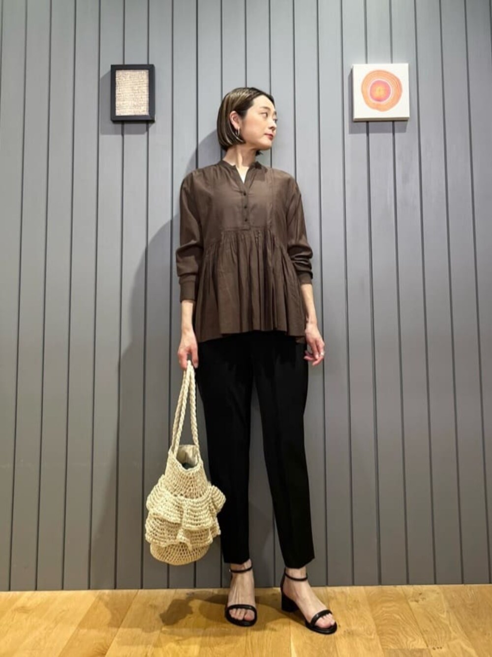 【サイズ感】 ブラウス: 標準 タンクトップ:細身 パンツ:標準 シューズ:標準 【コーディネートポイント】 結論シリーズのブラウスを、すっきりとしたテーパードパンツを合わせてキレイめにコーディネートしました。 ペーパー素材のフリルバッグで華やかさと夏らしさをプラスしました。