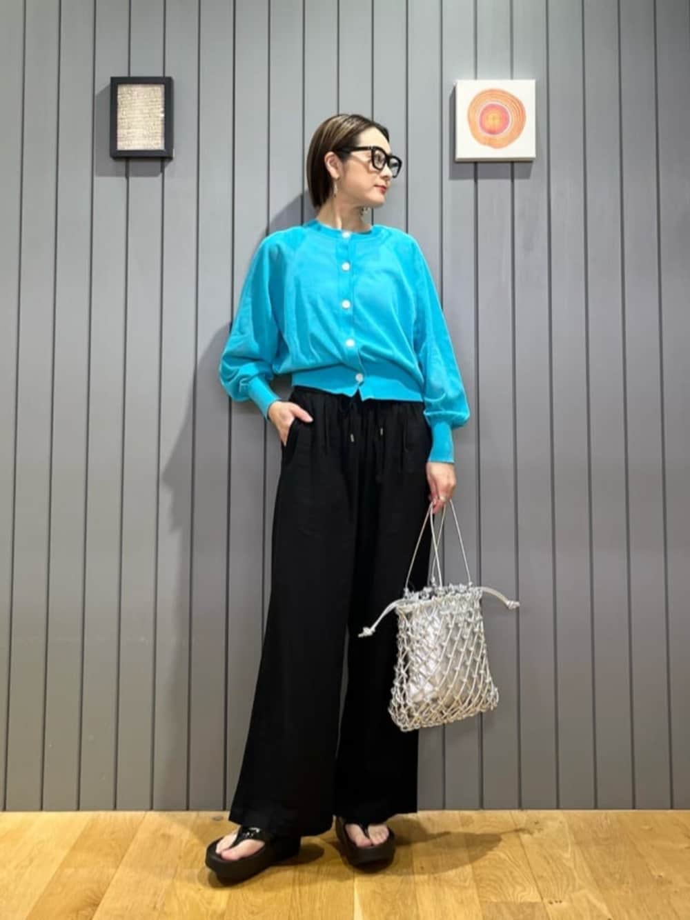 【サイズ感】 カーディガン:標準、程良いゆとり タンクトップ:細身 パンツ:ゆったりめ シューズ:標準 【コーディネートポイント】 袖のたっぷりとしたシルエットと鮮やかなブルーがポイントになるカーディガンを主役に、他をモノトーンでシンプルにコーディネートしました。