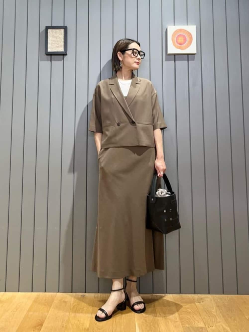 【サイズ感】 ジャケット:標準 ニット:ややコンパクト ワンピース:標準 シューズ:標準 【コーディネートポイント】 ジャケットとワンピースをセットアップで着用し、落ち着いたカラーでまとめました。