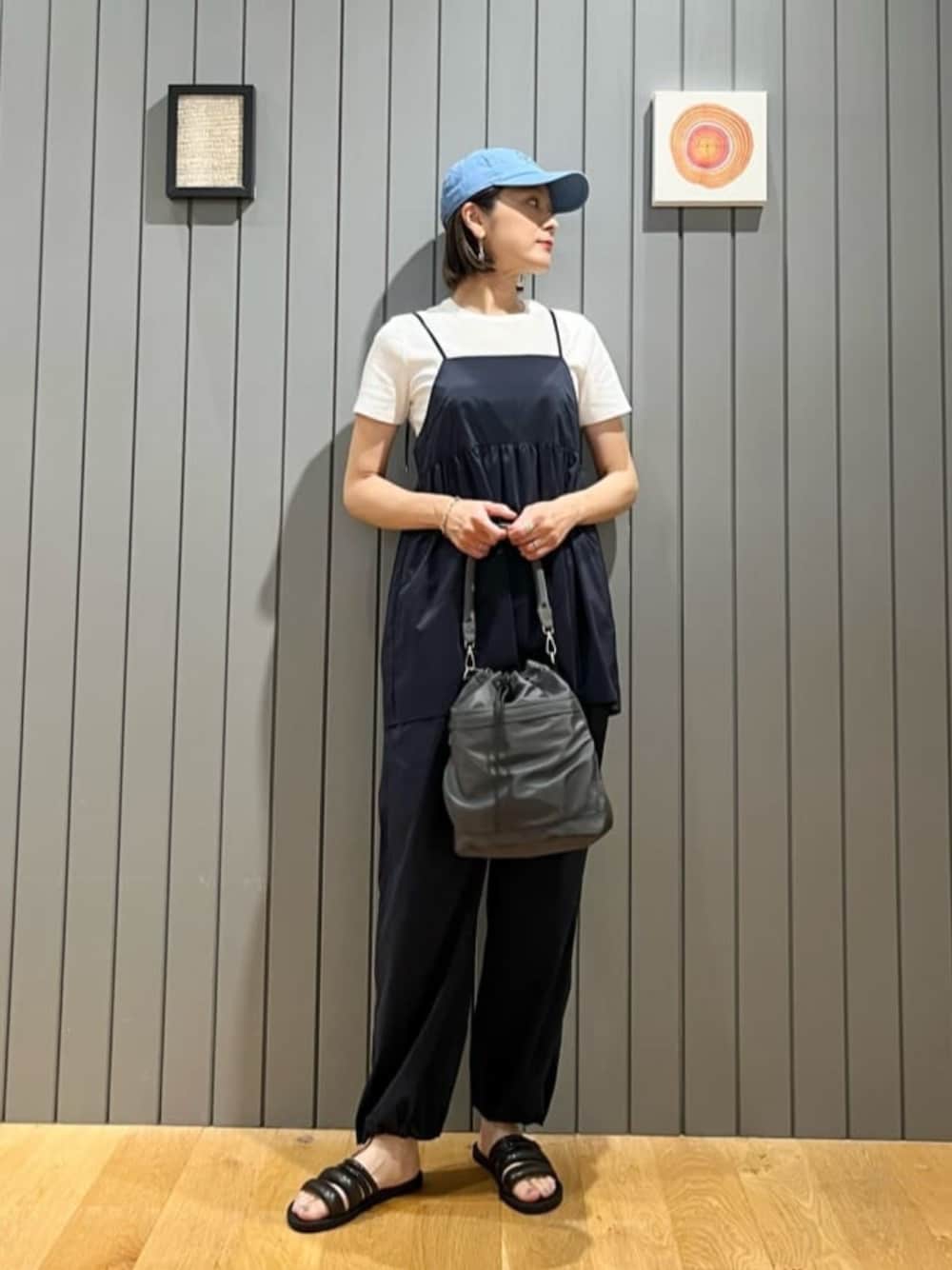 【サイズ感】 カットソー:小さめ キャミソール:標準 パンツ:標準、ほどよいゆとり シューズ:標準 【コーディネートポイント】 同素材のキャミソールブラウスとパラシュートパンツをセットアップで着用しました。 公園遊びなどアクティブなシーンにもおすすめのコーディネートです。 バッグやサンダルは落ち着いたカラーで揃え、ブルーのキャップで明るさをプラスしてポイントにしました。