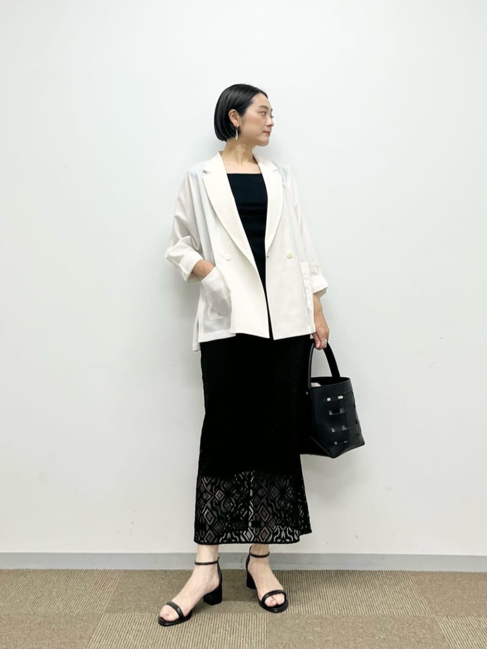 【サイズ感】 ジャケット:ゆったりめ タンクトップ:フィット感あり スカート:標準 シューズ:標準 【コーディネートポイント】 ブラックのカットソーとタイトスカートですっきりしたラインを作り、ゆったりめのジャケットで抜け感を出しました。 かっちりし過ぎず程よくきれいめで、お仕事やお食事などにおすすめのコーディネートです。
