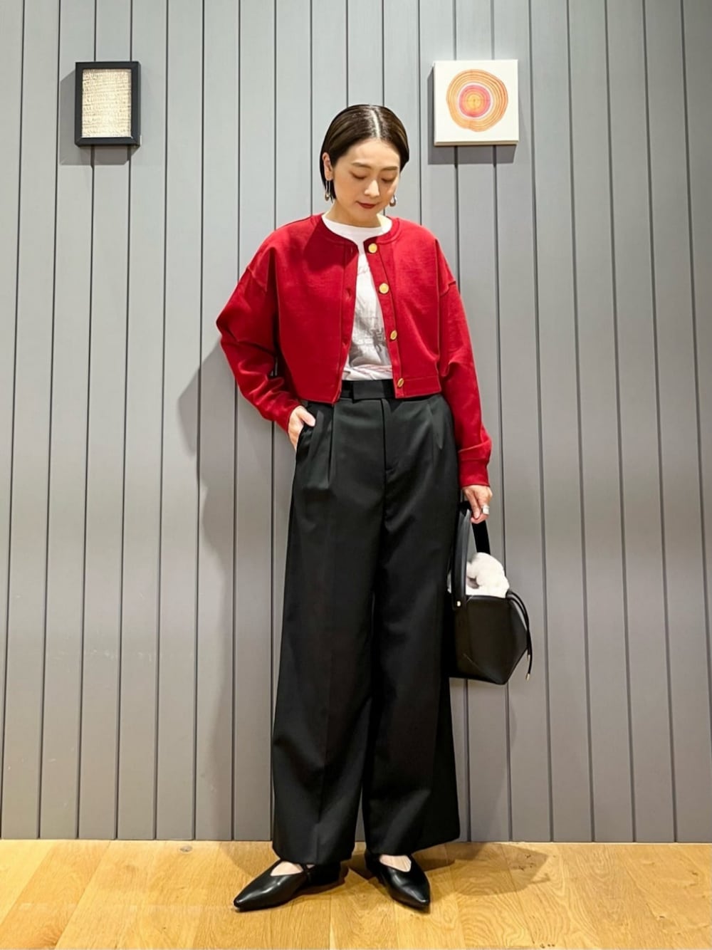 【サイズ感】 カーディガン:標準、丈短め Tシャツ:標準 パンツ:ややゆったり シューズ:標準 【コーディネートポイント】 モノトーンに赤を効かせたきれいめカジュアルスタイリングです。 ワイドパンツと相性の良いクロップド丈のカーディガンを合わせて、メリハリのあるシルエットに。