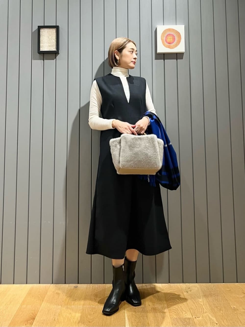【サイズ感】 ジャンパースカート:標準 カットソー:細身 シューズ:標準 【コーディネートポイント】 あたたかみのある素材感のジャンパースカートとタートルを合わせた、秋冬の通勤やお出かけにおすすめのキレイめスタイリングです。 コバルトブルーのストールとフェイクファーバッグで華やかさをプラスしました。
