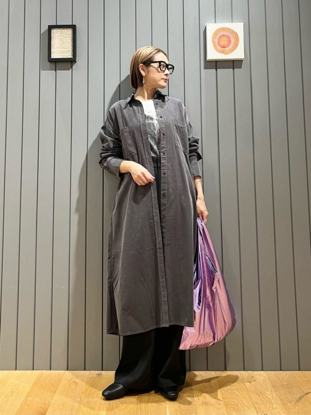 【サイズ感】 シャツワンピース:ややゆったり カットソー:標準 パンツ:ややゆったり シューズ:標準 【コーディネートポイント】 コーデュロイ素材のシャツワンピースをTシャツに羽織ったデイリーカジュアルスタイリング。 ボタンを閉めてワンピースとして着用し、ブーツと合わせるコーディネートもおすすめです。