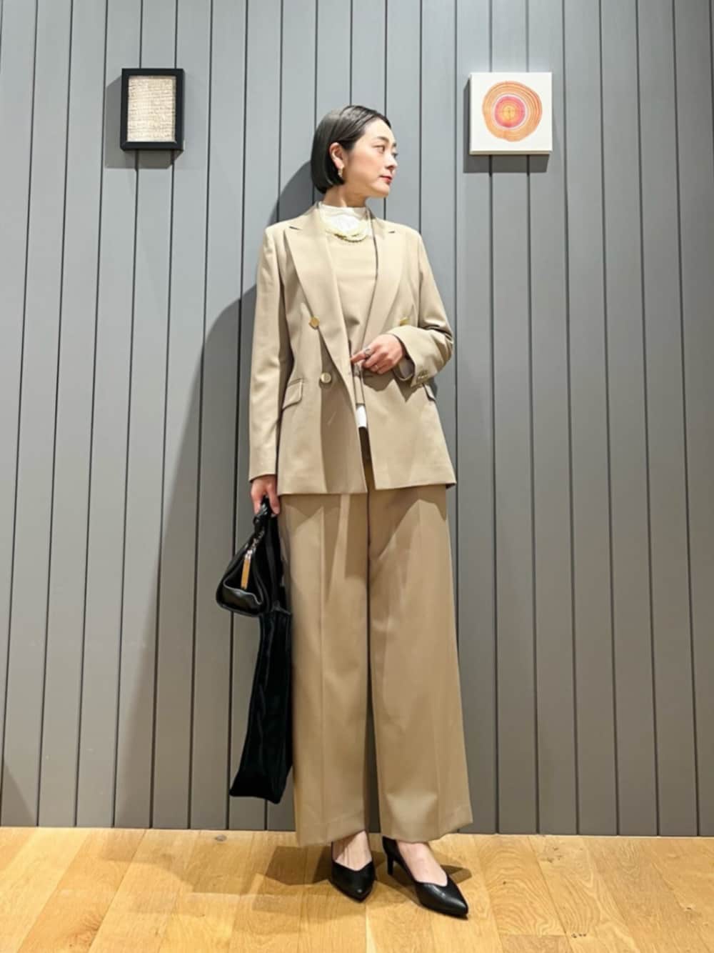 【サイズ感】 ジャケット:標準 ブラウス:標準 キャミソール:標準 パンツ:標準 シューズ:やや細身 【コーディネートポイント】 ベージュのセットアップでまとめたセレモニー向けスタイリングです。 入園・入学向けに明るいカラーでまとめました。 インナーに同素材のキャミソールを取り入れ、トレンド感をプラスしました。