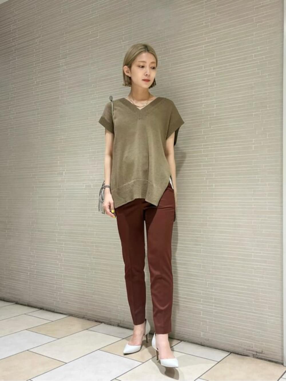 ●身長 163cm ●年齢 40代 ●サイズ トップス・ワンピース:38(M) ボトムス:36(S) シューズ:36h(23.5cm) 【サイズ感】 トップス/ゆったりしています。 パンツ/細身のシルエットです。 【コーディネートポイント】 カジュアルな印象のベストを艶感のあるパンツと、真っ白のパンプスで合わせて綺麗めを意識しました。