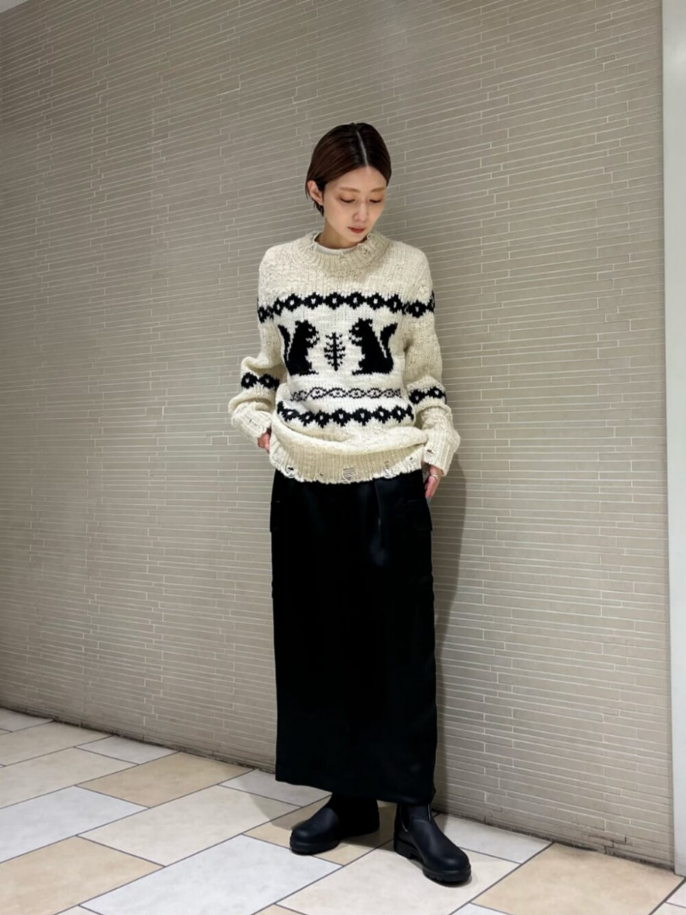 【コーディネートポイント】 柔らかい印象のニットに光沢のあるスカートを合わせました。