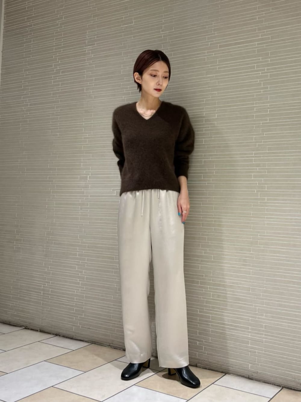 ●身長 163cm ●サイズ トップス・ワンピース:38(M) ボトムス:36(S) シューズ:36h(23.5cm) 【サイズ感】 ニット/標準的です。 パンツ/Sサイズ着用してます。ヒールを履くと少し丈が短めになります。 【コーディネートポイント】 ふわふわのニットなので、艶感のあるパンツを合わせました。