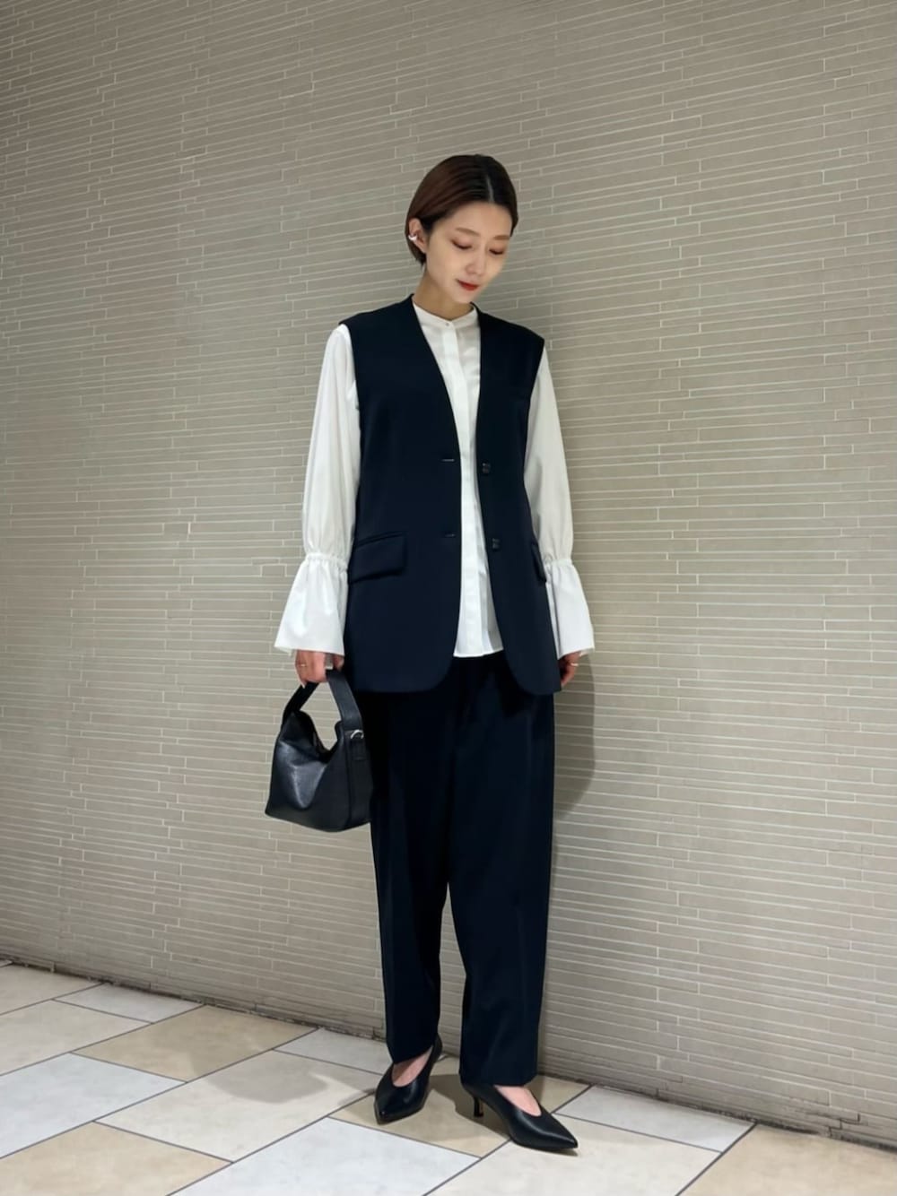●身長 163cm ●サイズ トップス・ワンピース:38(M) ボトムス:36(S) シューズ:36h(23.5cm) 【サイズ感】 ベスト/標準的です。 ブラウス/標準的です。 パンツ/ゆったりとしたシルエットです。 【コーディネートポイント】 セレモニースタイルのご提案です。