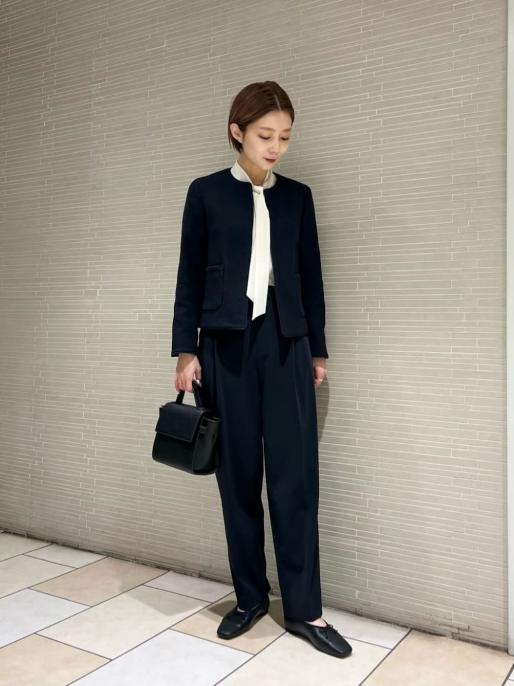 ●身長 163cm ●サイズ トップス・ワンピース:38(M) ボトムス:36(S) シューズ:36h(23.5cm) 【サイズ感】 ジャケット/標準的です。 ブラウス/標準的です。 パンツ/ややゆったりとしたサイズ感です。 【コーディネートポイント】 セレモニースタイルのご提案です。