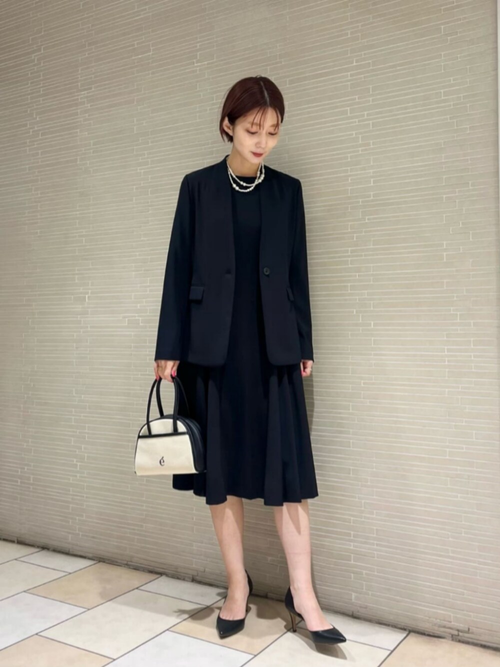 【サイズ感】 ジャケット/標準的です。 ワンピース/標準的です。 【コーディネートポイント】 同素材のセットアップで、セレモニースタイルのご提案です。