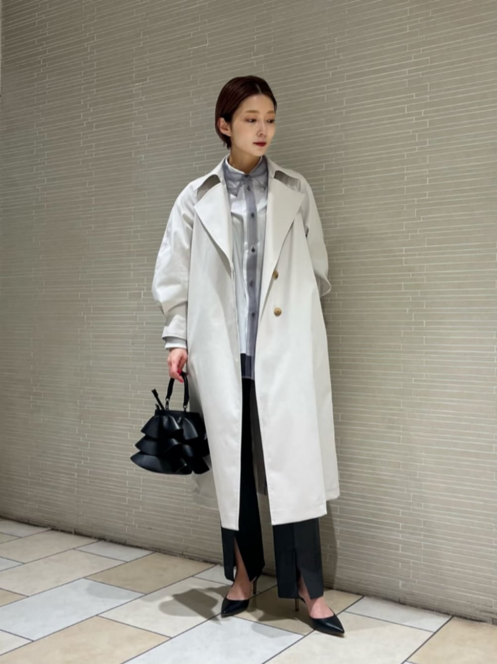 ●サイズ トップス・ワンピース:38(M) ボトムス:36(S) シューズ:36h(23.5cm) 【サイズ感】 アウター/ゆったりとしたサイズ感です。 シャツ/標準的です。 パンツ/標準的です。 【コーディネートポイント】 全体的にグレーでまとめました。