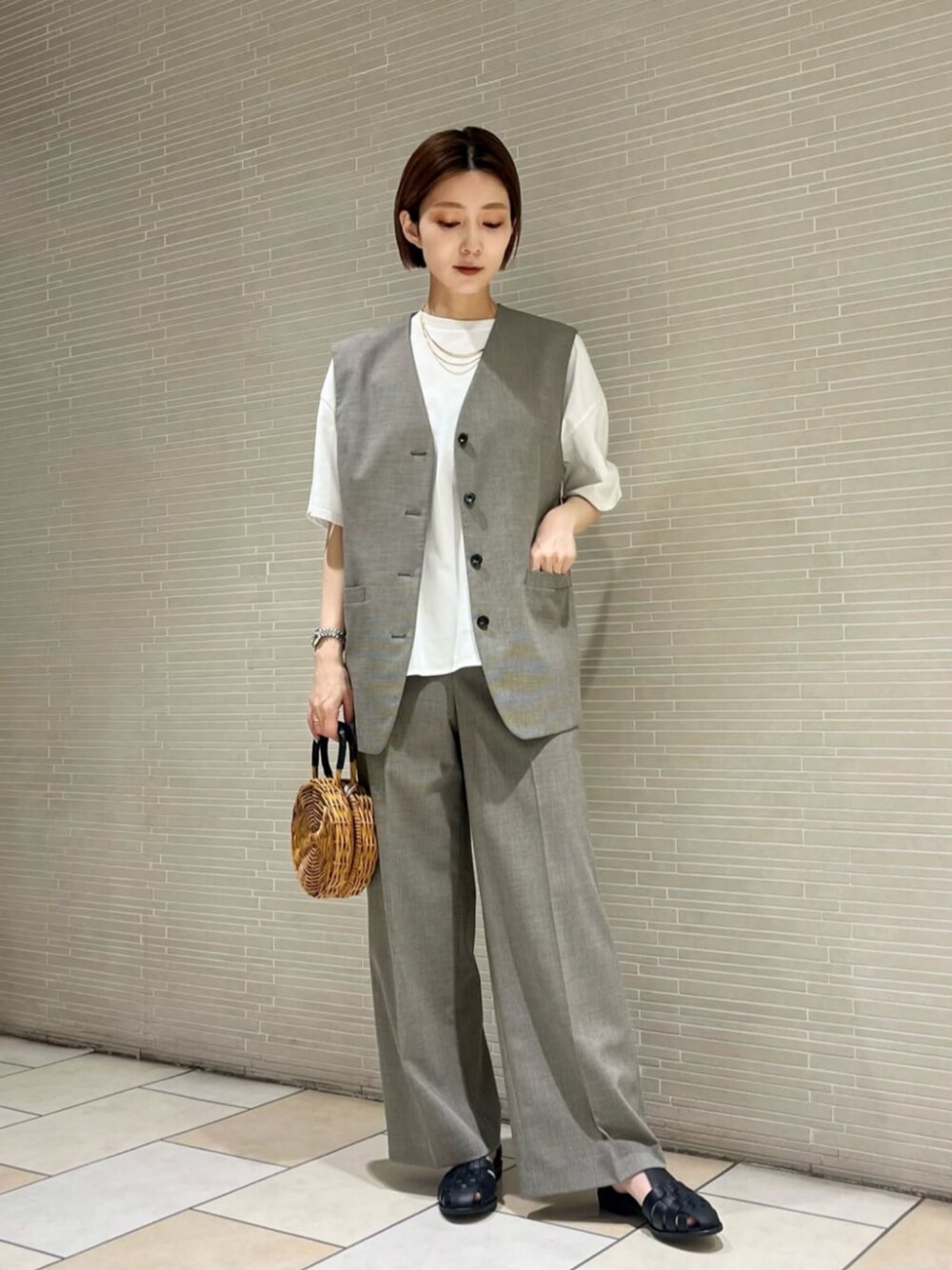 ●身長 163cm ●サイズ トップス・ワンピース:38(M) ボトムス:36(S) シューズ:36h(23.5cm) 【サイズ感】 ベスト/標準的です。 カットソー/ややゆったりとしています。 パンツ/ゆったりとしたラインです。 【コーディネートポイント】 ベストとのセットアップをカジュアルな雰囲気で着用しました。
