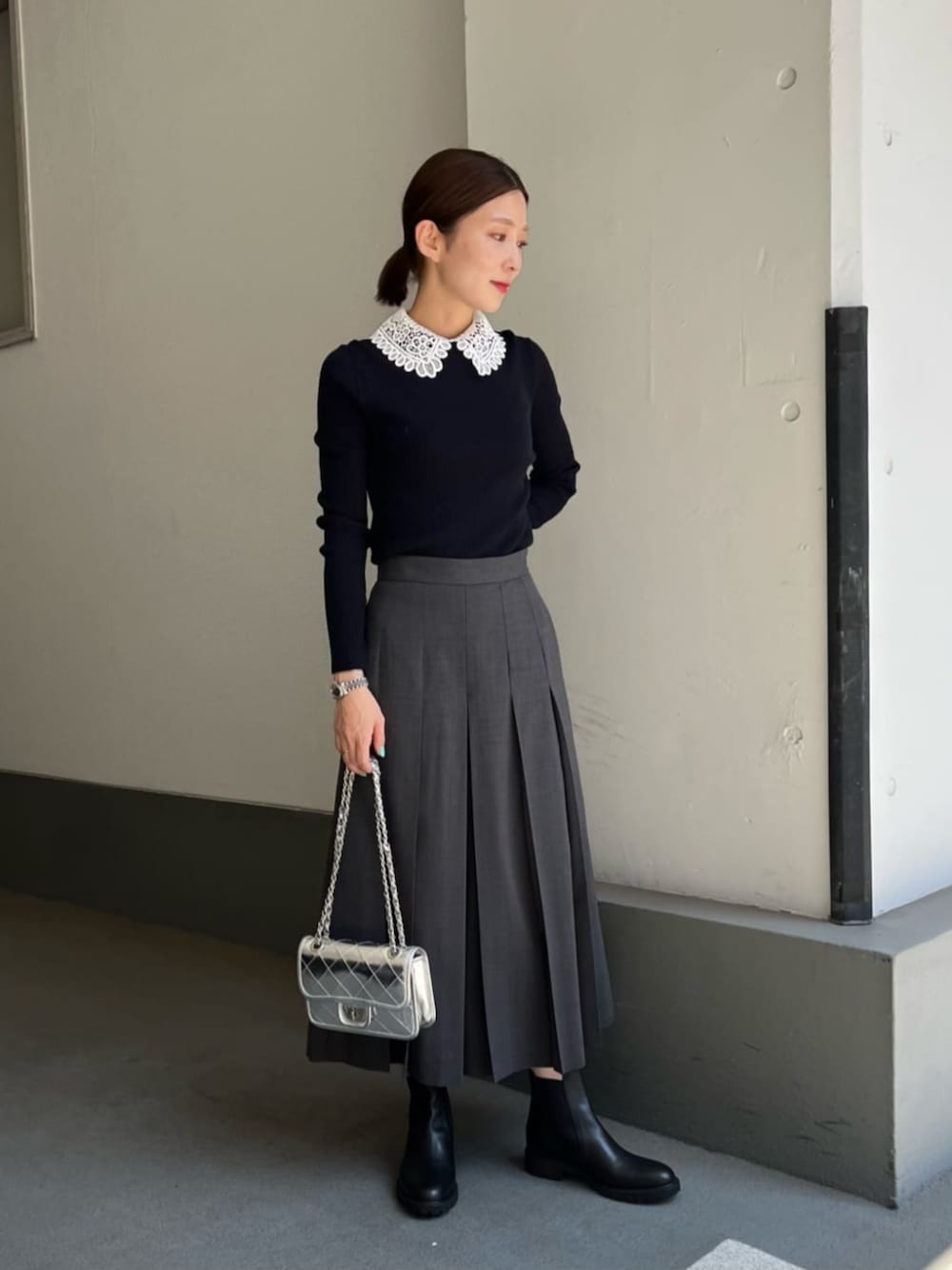 ●身長 163cm ●サイズ トップス・ワンピース:38(M) ボトムス:36(S) シューズ:36h(23.5cm) 【サイズ感】 トップス/コンパクトなサイズ感です。 スカート/標準的です。 【コーディネートポイント】 襟付きのニットをレトロな雰囲気で合わせました。