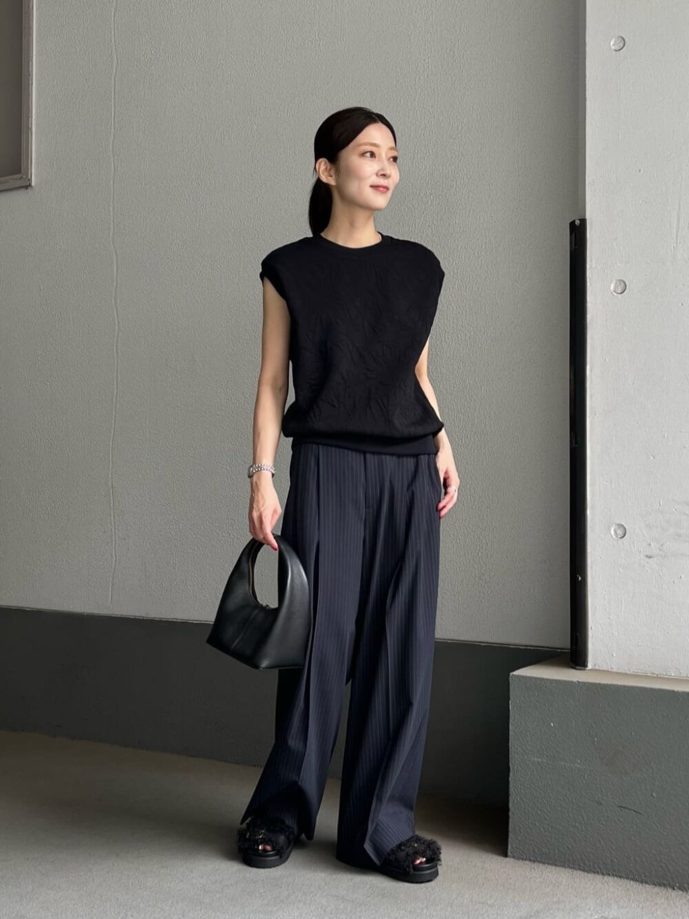 ●身長 163cm ●サイズ トップス・ワンピース:38(M) ボトムス:36(S) シューズ:36h(23.5cm) 【サイズ感】 トップス/標準的です。 ボトムス/ややゆったりとしています。 【コーディネートポイント】 ストライプのメンズライクな雰囲気のパンツにスウェットのトップスを合わせました。トップスはスッキリとしたサイズ感なので、ブラックで合わせると全体的に落ち着いた印象になり、オフィスカジュアルにもオススメです。