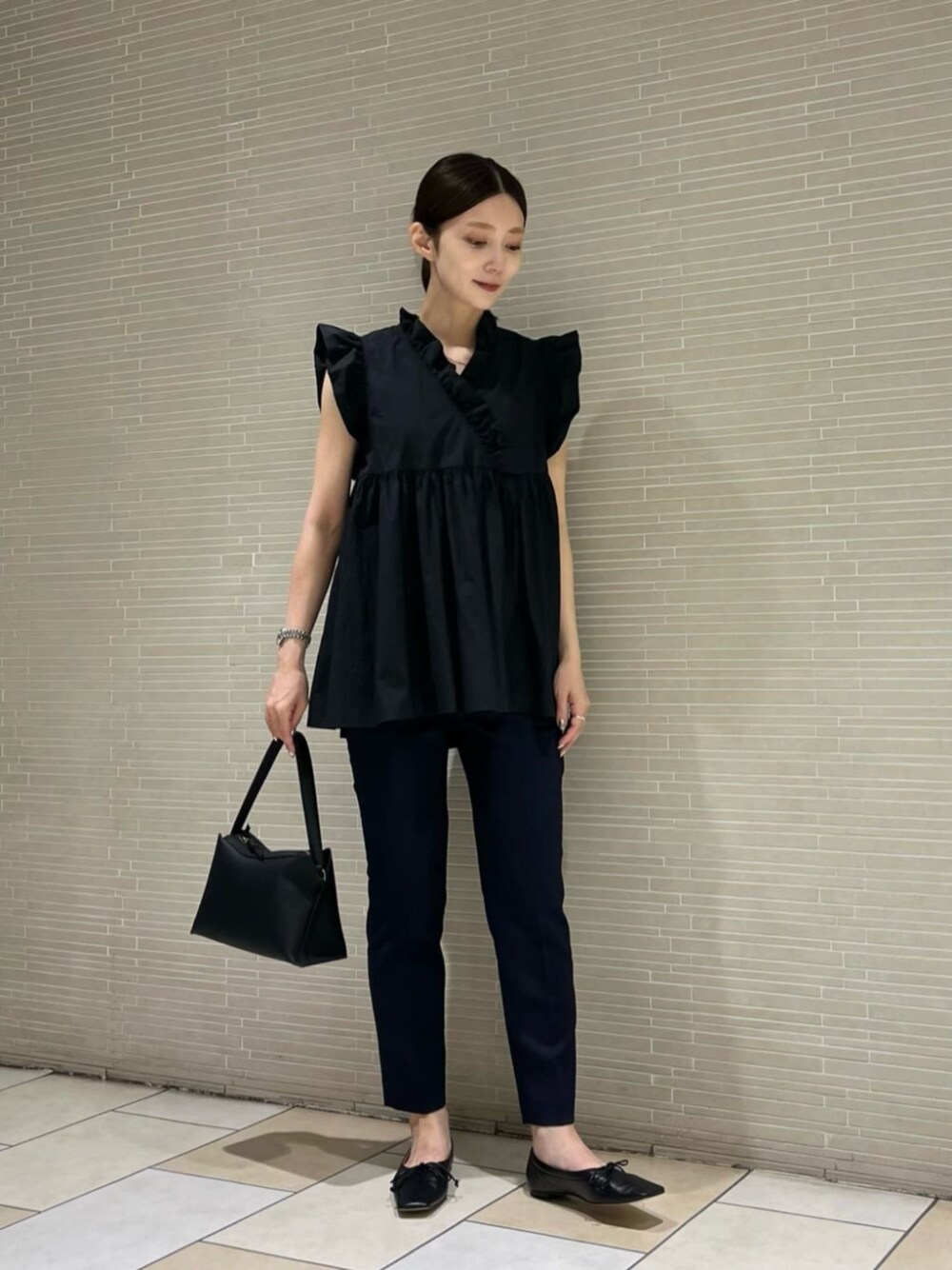 ●身長 163cm ●サイズ トップス・ワンピース:38(M) ボトムス:36(S) シューズ:36h(23.5cm) 【サイズ感】 トップス/ややボリュームがあります。 ボトムス/細身でスッキリしています。 【コーディネートポイント】 着丈長めのブラウスに、細身のボトムスを合わせた定番スタイルです。 トップスはボリュームが出ますが、胸元がスッキリしているのがオススメです。