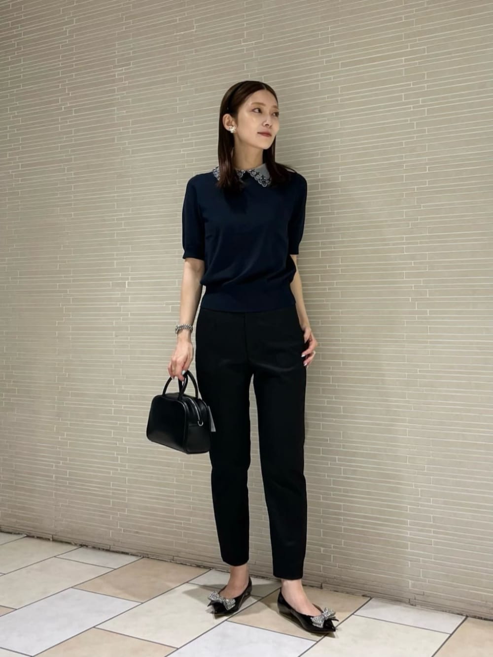 ●身長 163cm ●サイズ トップス・ワンピース:38(M) ボトムス:36(S) シューズ:36h(23.5cm) 【サイズ感】 トップス/スッキリとしたサイズ感です。 ボトムス/細身のシルエットです。 【コーディネートポイント】 オフィスカジュアルをイメージして、フェミニンな印象でコーディネートしました。