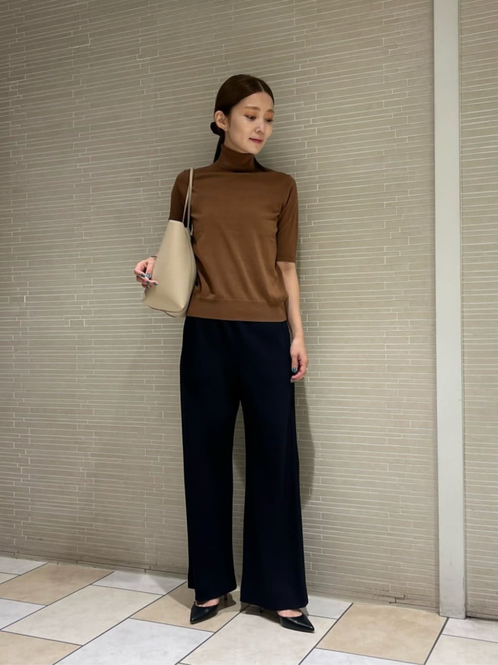 ●身長 163cm ●サイズ トップス・ワンピース:38(M) ボトムス:36(S) シューズ:36h(23.5cm) 【サイズ感】 トップス/スッキリとしたサイズ感です。 ボトムス/標準的です。 【コーディネートポイント】 オフィスカジュアルをイメージしました。落ち着いた色味のブラウンがオススメです。