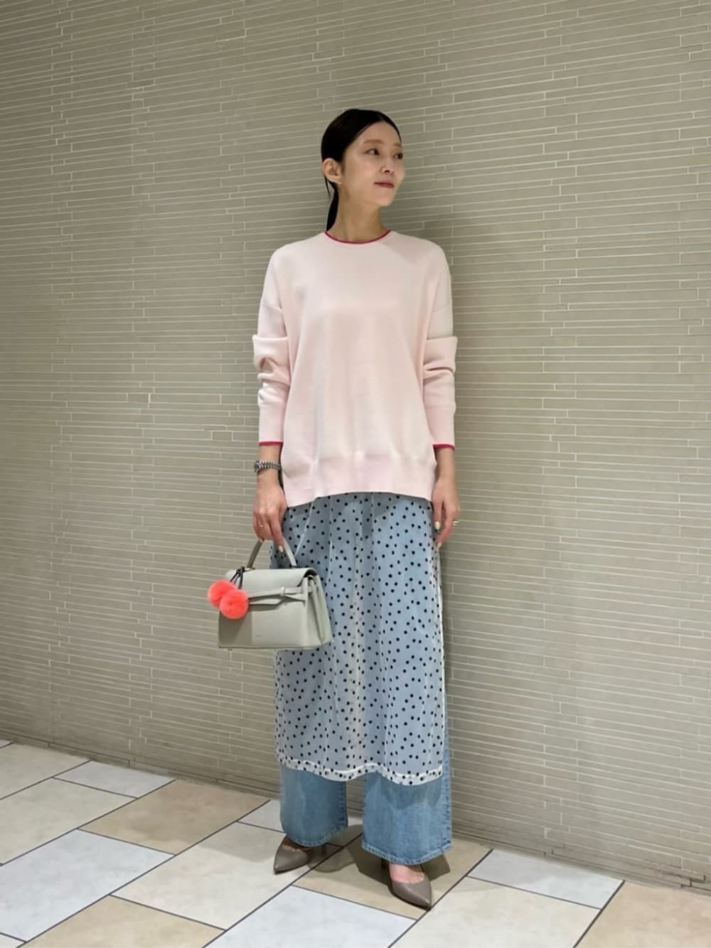 ●身長 163cm ●サイズ トップス・ワンピース:38(M) ボトムス:36(S) シューズ:36h(23.5cm) 【サイズ感】 トップス/標準 スカート/標準 デニム/標準 【コーディネートポイント】 今から春先まで長くお召しいただける春色のニットをポイントにコーディネートしました。シンプルにデニムあわせでも可愛いてわすが、レイヤードにオススメのシアーなスカートをあわせていただくと今年らしい雰囲気になります。