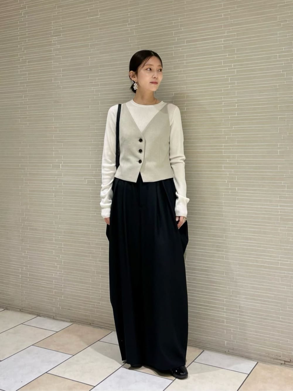 ●身長 163cm ●サイズ トップス・ワンピース:38(M) ボトムス:36(S) シューズ:36h(23.5cm) 【サイズ感】 ニット/標準 ベスト/標準 ボトムス/標準 【コーディネートポイント】 ボトムスにボリュームがあるのでトップスはスッキリとまとめました。