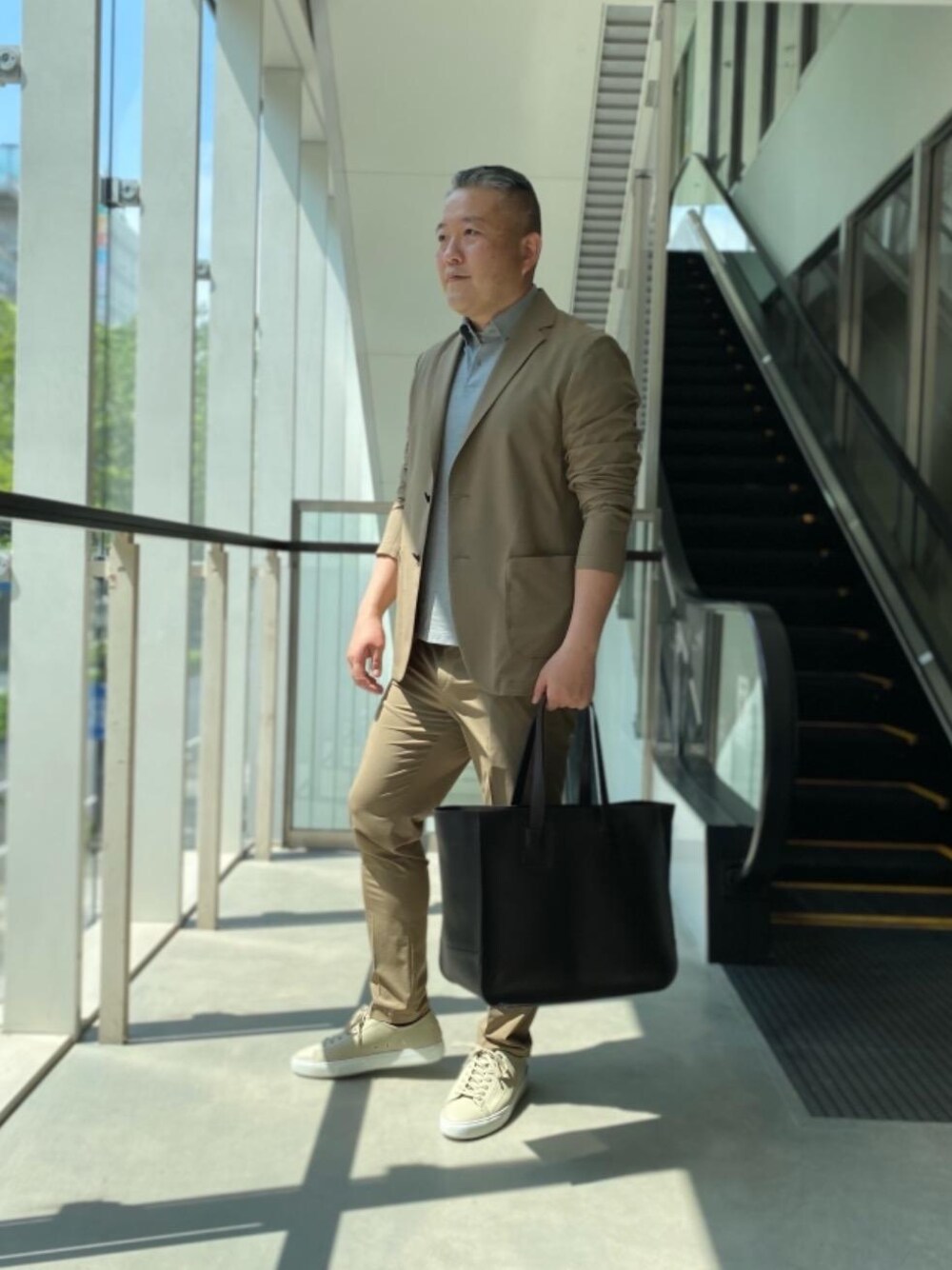 ●身長:173cm ●普段のサイズ:LARGE 48、シューズ9h 10 【サイズ感】 ジャケット、パンツ共に細身です。カットソーはかなり細身で肩胸のある方はワンサイズ大きくしても良いかも知れません。 【素材感】 セットアップは薄手で軽く、伸縮性があります。カットソーは柔らかく上品な質感です。 【着心地】 シャツを羽織る様な軽い着心地です。 【コーディネート】 茶系と一緒に相性の良いライトグレーをワントーンになる合わせてみました。