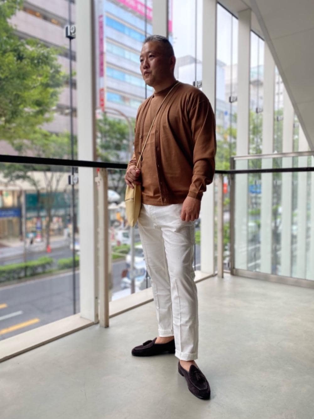 ●身長:173cm ●普段のサイズ:LARGE 48、シューズ43 【サイズ感】 トップス通常サイズ、ボトムスは腰回りにややゆとりがあります。 【素材感】 カーディガン、カットソーはしっかりした生地感、パンツは薄手です。 【着心地】 トップス生地柔らかく着心地良いです。パンツは薄手で軽い感じです。 【コーディネート】 落ち着いた茶系を涼しげな色と合わせてみました。