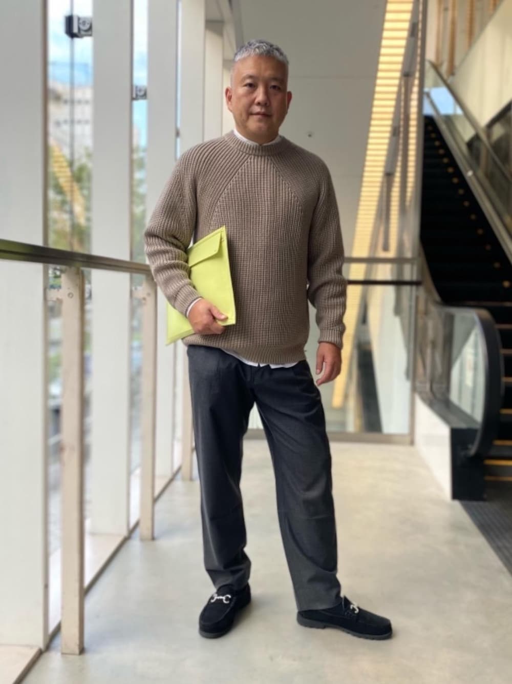 ●身長:173cm ●普段のサイズ:LARGE 48、ドレスシューズ8h スニーカー28 【サイズ】 ニット、パンツはゆったり目のサイズ感、シャツはややゆとりが有ります。 【素材】 ニット、パンツは冬素材ですが毛羽立ちの少ない生地感。バックは少し起毛した手触りです。 【着心地】 適度なゆとりが良い着心地です。 【コーディネート】 初冬を意識して、少し暖かみを感じる素材でスタイリングしてみました。