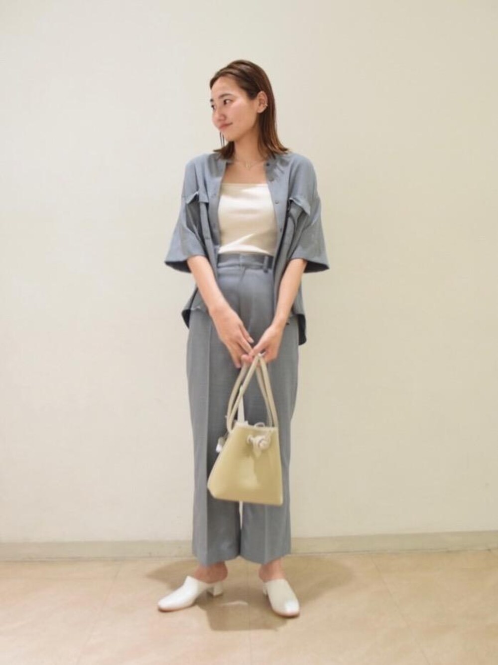 年齢:20代後半 身長:164㎝ 普段サイズ:トップスM,パンツM,シューズ25.0 【サイズ感】 トップス:身幅ゆったり パンツ:ややすっきり シューズ:標準的 【素材感】 リネンライクなポリエステル100%でさらっとした素材感です。 【着心地】 さらりとした肌触りでリラックスしてご着用いただけます。 【コーディネートのポイント】 セットアップですが気張らずに着用いただけます。単品使いでも着回しができるのでとてもオススメです。 色のトーンを統一させてコーディネート組みました。