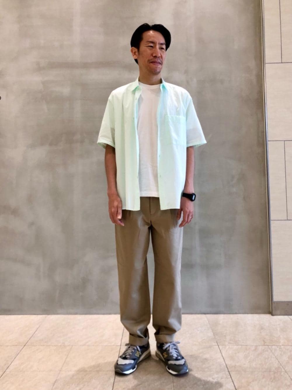 ・身長:184cm ・普段サイズ:トップスL/インナーL/ボトムスL/シューズ29.0センチ 【サイズ感】 シャツ:ゆったり パンツ:ゆったり シューズ:標準 【素材感】 シャツ:ちりめんのようなシボ感が特徴で、シャリシャリしたドライタッチと軽さがポイント。 パンツ:古着のようなクタっとしたチノクロス。 【着心地】 シャツ:肌の接地面が少なく凹凸感があり、肌離れが良く盛夏にピッタリ。 パンツ:深めのプリーツと裾にかけて絞りを効かせたワイドテーパード型。