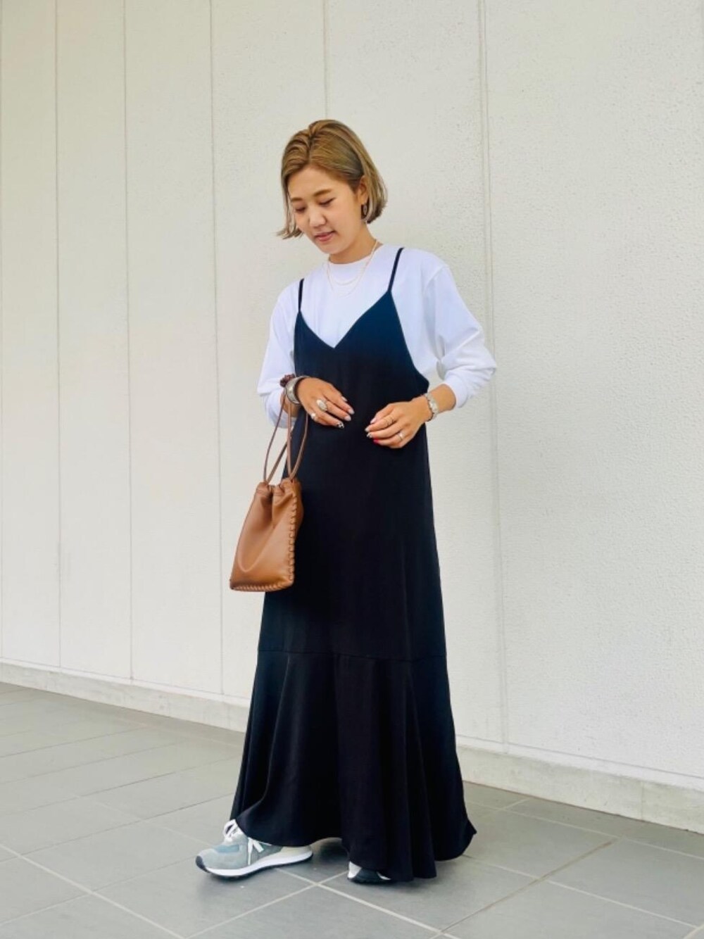 ●身長:154cm ●普段サイズ:アウターSサイズ/ボトムスSサイズ/シューズ23cm 【サイズ感】 ●ワンピース:標準的なサイズ感です。長さは肩紐で調節出来ます。 ●シューズ:標準的なサイズ感です。 【素材感・着心地】 ●ワンピース:透け感もなくオールシーズン着用出来る素材です。ゆったりしたシルエットで楽に着れます。 【コーディネートポイント】 キャミソール型のワンピースが甘くなり過ぎないように、プリントのカットソーとスニーカーとのカジュアルアイテムとコーディネートしました! カットソーとスニーカーをニューバランスで揃えたところもポイントです! カットソーは特にバックプリントが印象的で、後ろから見たスタイリングにも注目していただきたいです!