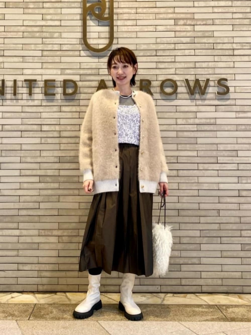 【サイズ感】 ニットカーディガン:ゆったりとしたブルゾンのようなカーディガンです。 ニットベスト:身幅はゆったり、着丈はやや短めです。 スカート:36サイズを着用しています、ウエストがゴムでゆったりしています。38サイズと比べるとボリュームが抑えられスッキリとします。 ブーツ:足幅はやや広めです、履き口が細身です。
