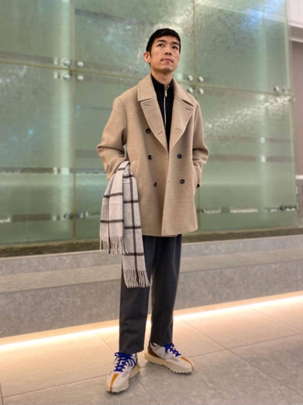 [身長]174㎝ [普段サイズ]トップス:M ボトムス:M スニーカー:27㎝ 革靴:25.5㎝ [サイズ感/着心地] アウター:ゆったりしていて軽い着心地 ニット:標準的なサイズ感でサラッとした着心地 パンツ:プリーツがありウエスト周りにややゆとりを持たせている [素材感] アウター: 二重織りメルトン生地を使用しており肉厚ながら軽さがある ニット:細かな編み地が柔らかでソフトな肌触り パンツ:サキソニー地で適度に伸び縮みする [コーディネートポイント] ややゆったりとしたピーコートをウールパンツとスニーカーで上品にまとめました。 ベージュ×グレーの色合わせは全体が品良くまとまるのでおすすめです。