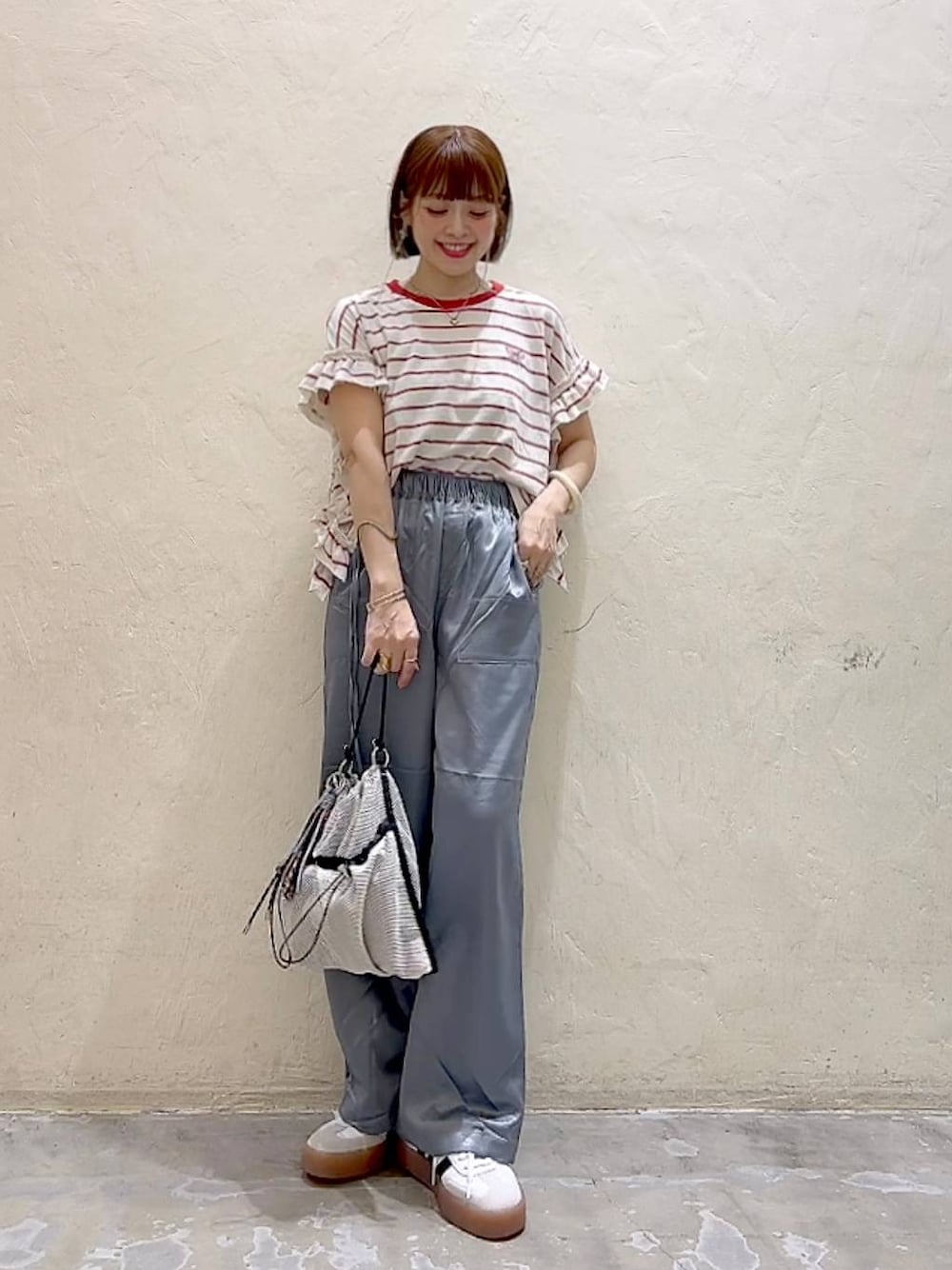 カジュアルな楽ちんコーデ Tシャツにパンツとカジュアルコーデですが サテンのパンツを取り入れることで こなれ感のあるスタイルに♡ フリルのついたTシャツはこれだけで 存在感をしっかり出してくれます。 ぜひチェックしてね♡ お洋服はもちろん、それ以外も いろいろ載せてます♡ ぜひチェックしてください^^